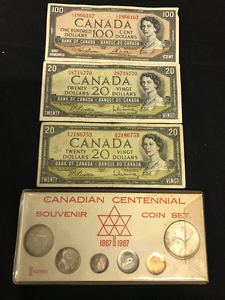 CANADIAN CURRENCY LOT INC. $100 BANK NOTE DATED 1954, 2 X $20 BANK NOTES DATED 1954 AND A CANADIAN CENTENNIAL SOUVENIR COIN SET 1867-1967