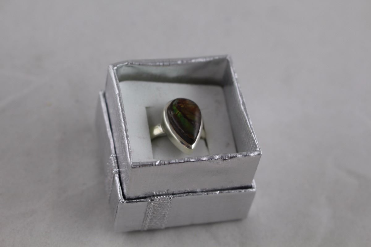 CANADIAN FREE FORM AMMOLITE RING, STERLING SILVER, GOOD COLOUR PLAY, INCLUDES $300 CERTIFICATE