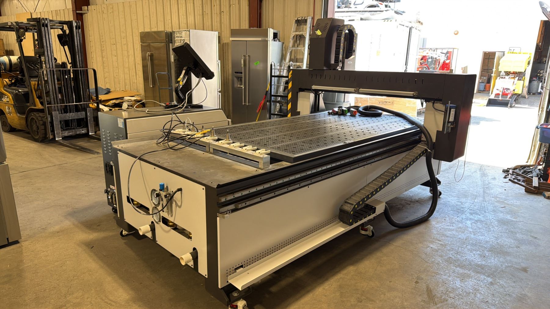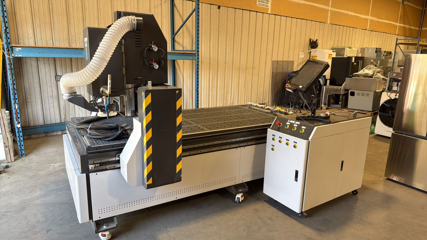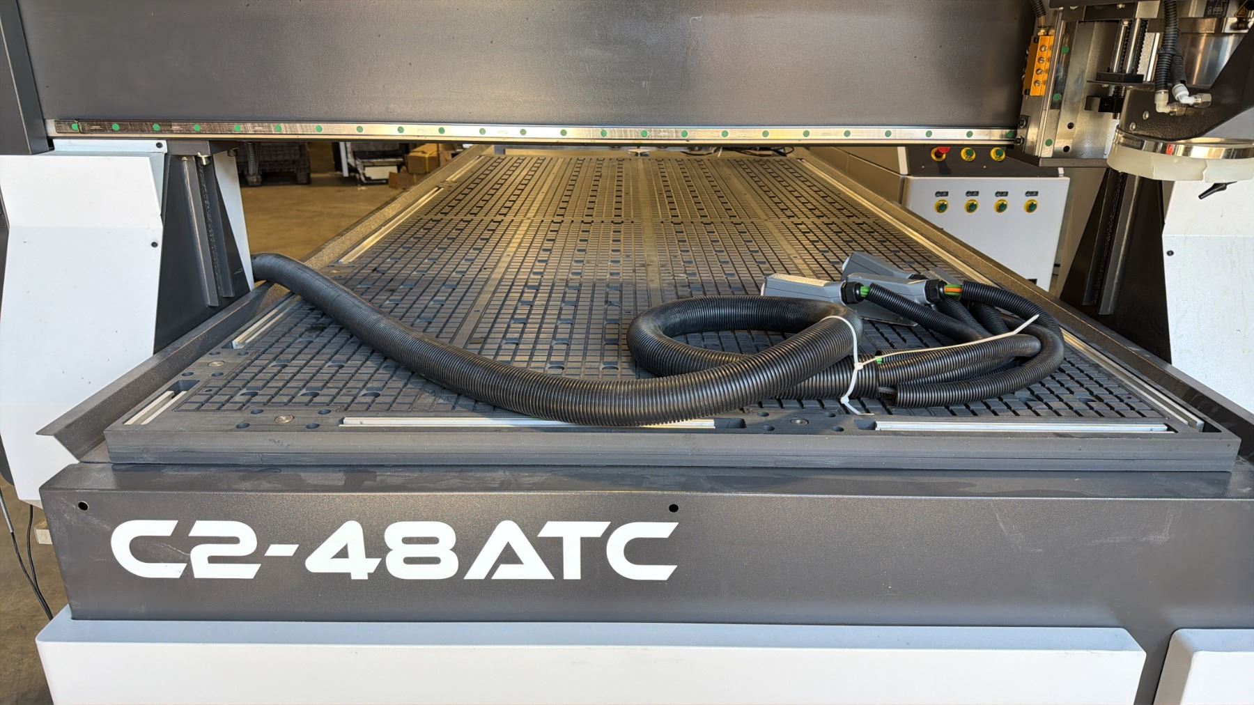 CANCAM C2-48ATC CNC MACHINE WITH MASSO G3 TOUCH 15" INDUSTRIAL CAPACITIVE TOUCHSCREEN CONTROL & BLACK BOX HURRICANE INDUSTRIAL ELECTRIC CNC VACUUM SYSTEM WITH HOSE MACHINE WEIGHS APPROX 3,800 LBS MACHINE MEASURES APPROX 135" X 90" X 80"H
