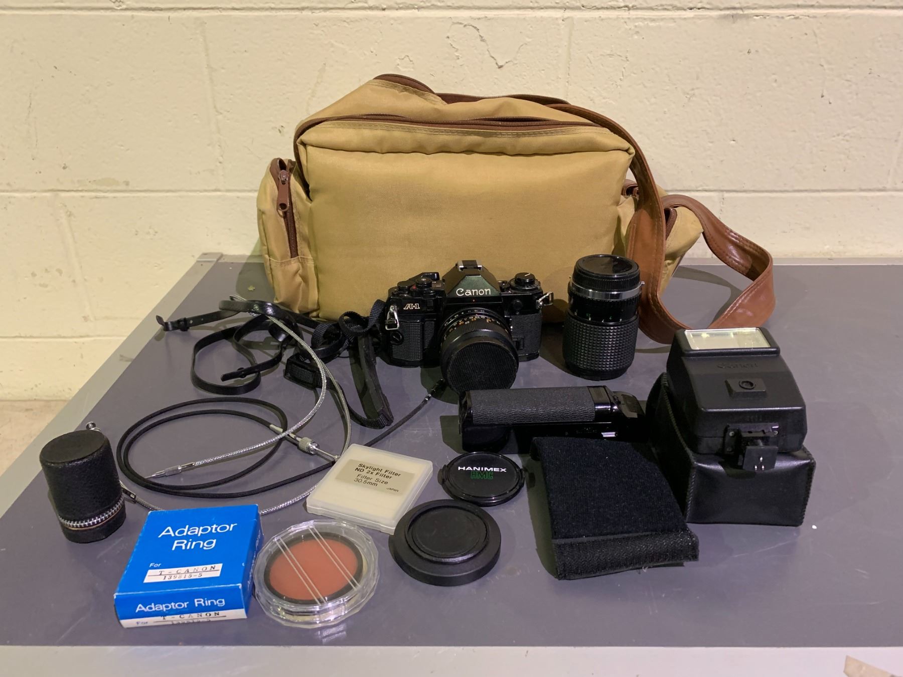 CANON A-1 VINTAGE CAMERA WITH CARRYING BAG AND ACCESSORIES