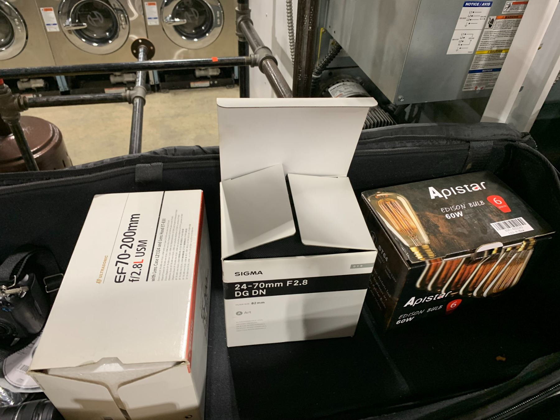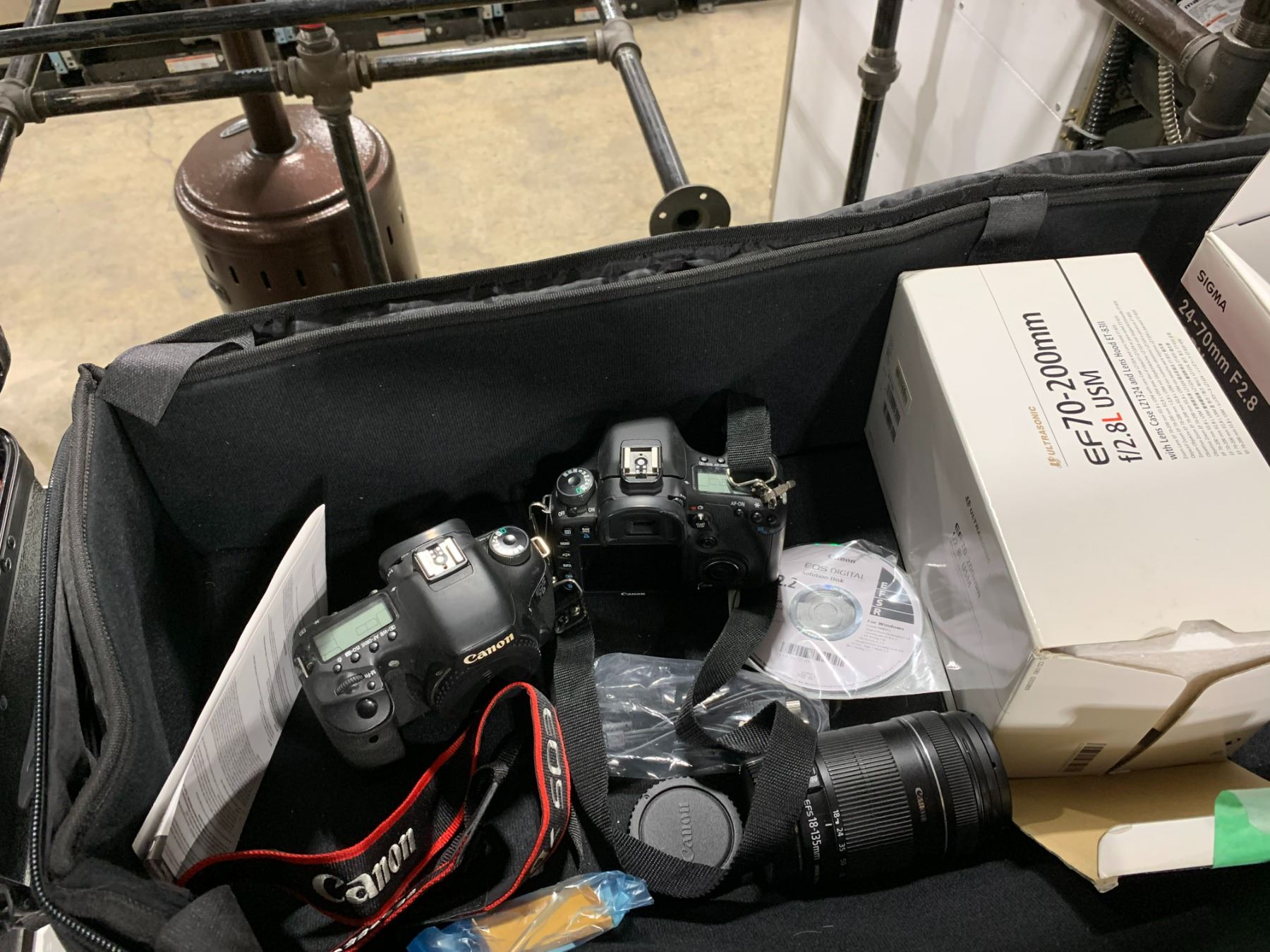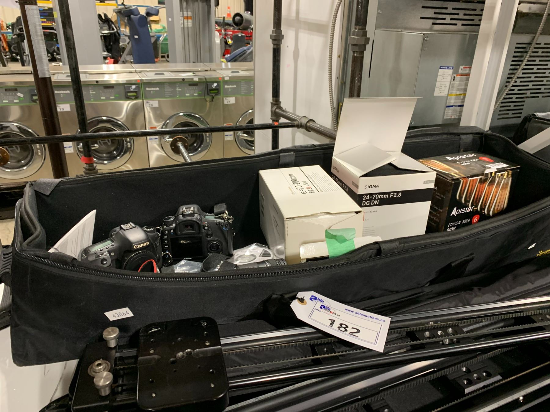 CANON EOS 7D DIGITAL CAMERA WITH LEN / STRAP, CANON EOS 7D DIGITAL CAMERA BODY, CANON EF 70-200MM LENS, SIGMA 24-70MM F2.8 DG DN LENS, & 60W EDISON BULBS IN LARGE SOFT TRANSPORT CASE