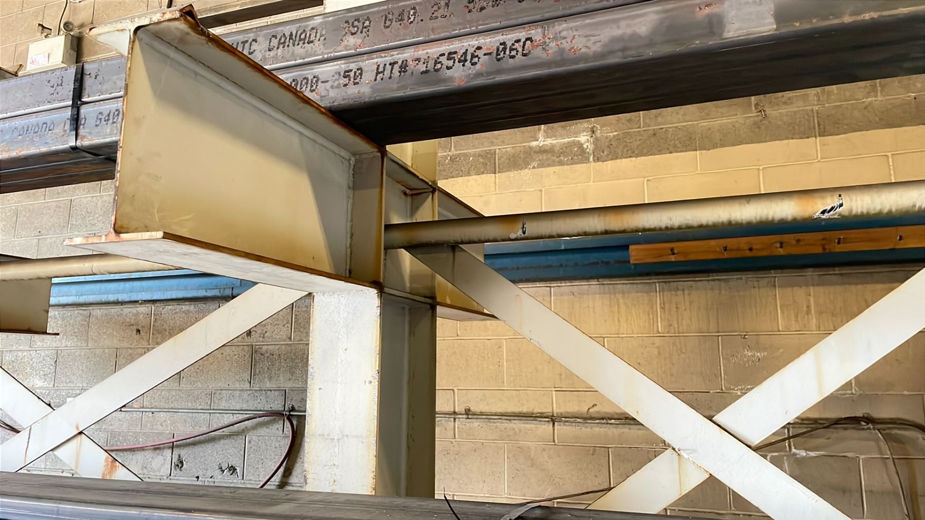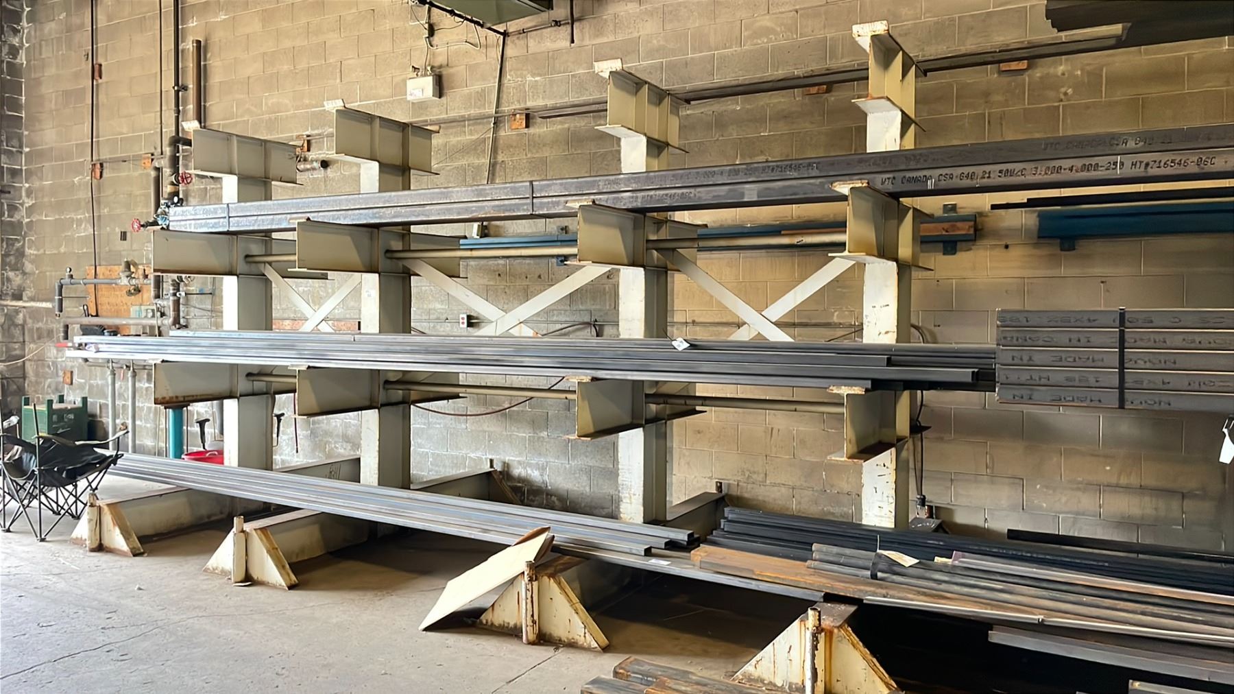 CANTILEVER METAL STORAGE RACK SYSTEM *WELDED TOGETHER, DOES NOT DISASSEMBLE* MEASURES APPROX. 18FT ACROSS X 7 1/2FT WIDE X 9 1/2FT HIGH **LAST DAY REMOVAL** SATURDAY SEP 6 REMOVAL
