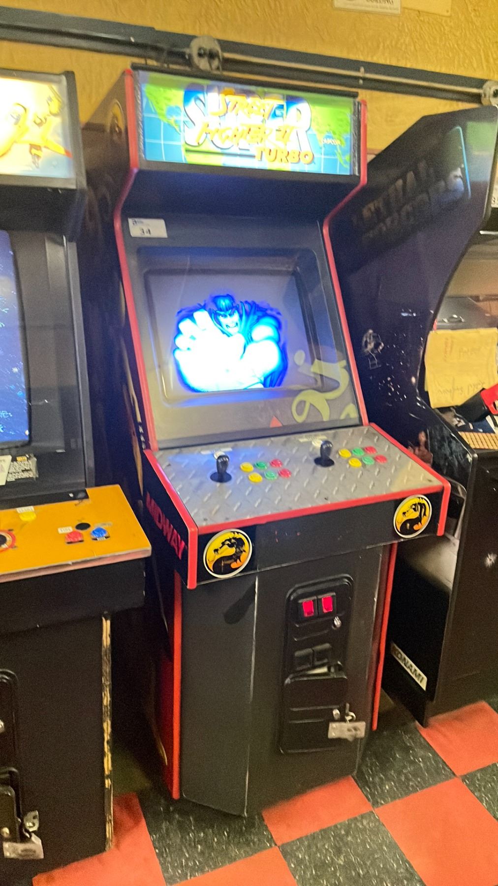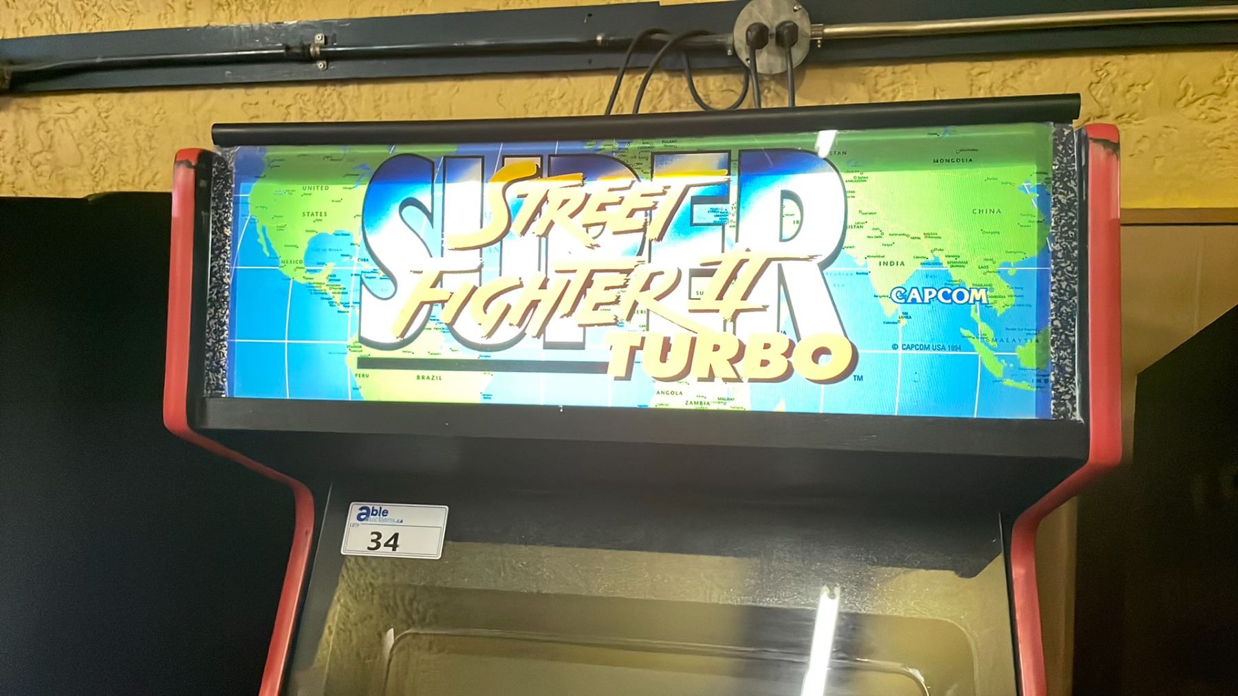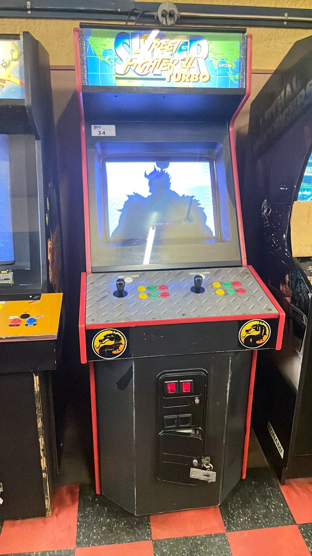CAPCOM STREET FIGHTER II TURBO 2 PERSON COIN OPERATED UPRIGHT ARCADE GAME IN MIDWAY MORTAL KOMBAT CABINET