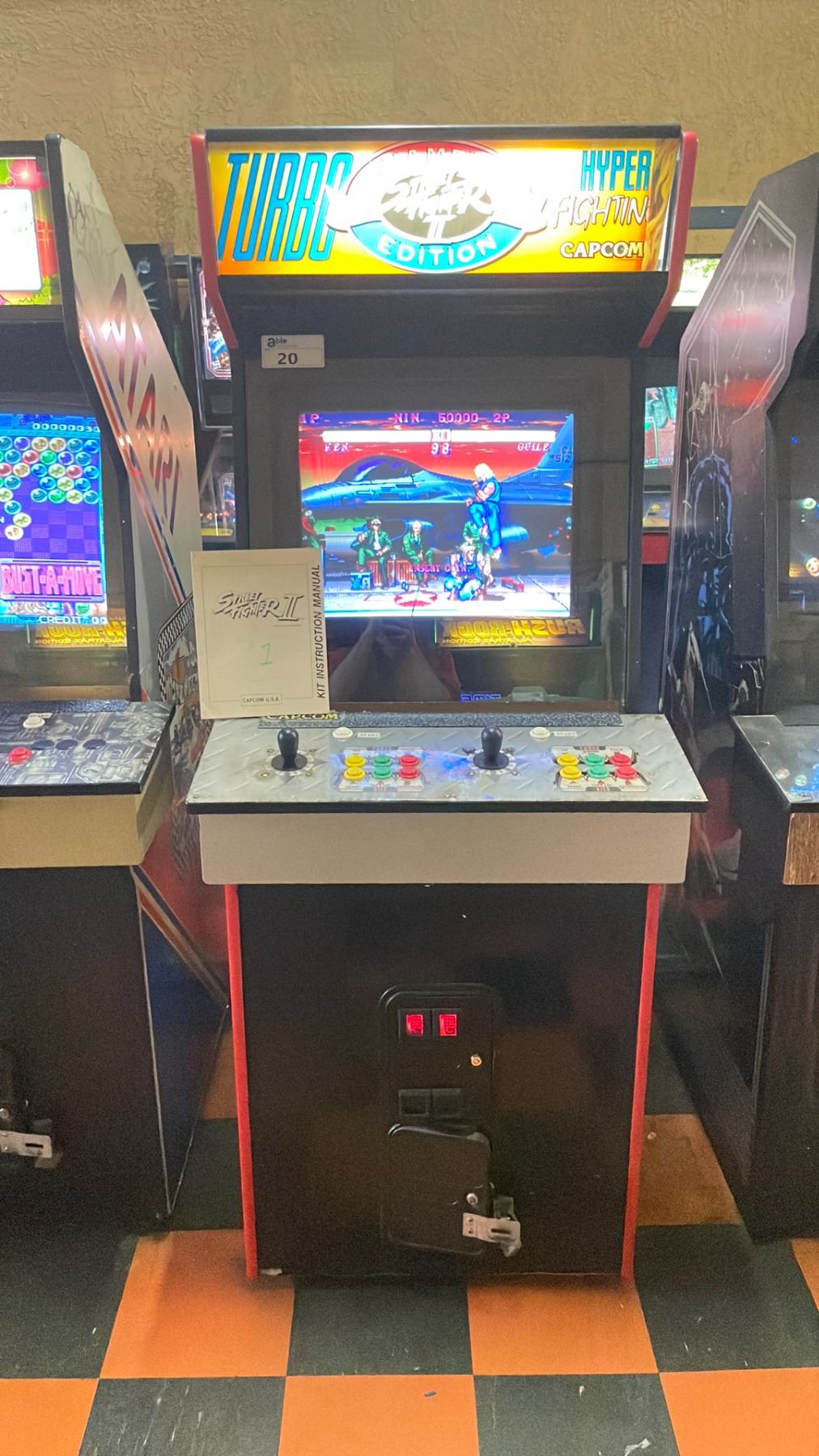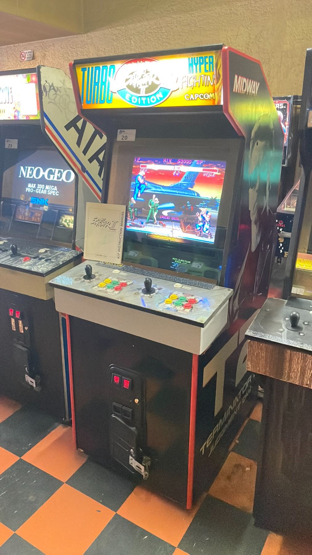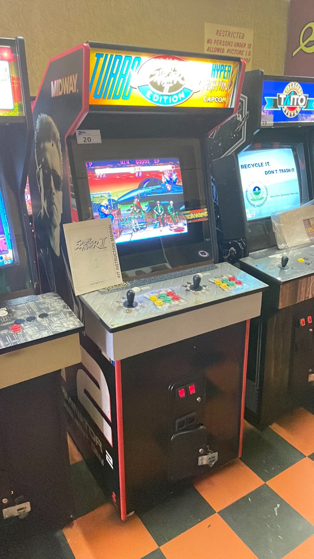 CAPCOM STREET FIGHTER II TURBO CHAMPION EDITION 2 PERSON COIN OPERATED UPRIGHT ARCADE GAME IN MIDWAY TERMINATOR 2 JUDGEMENT DAY CABINET WITH MANUALS