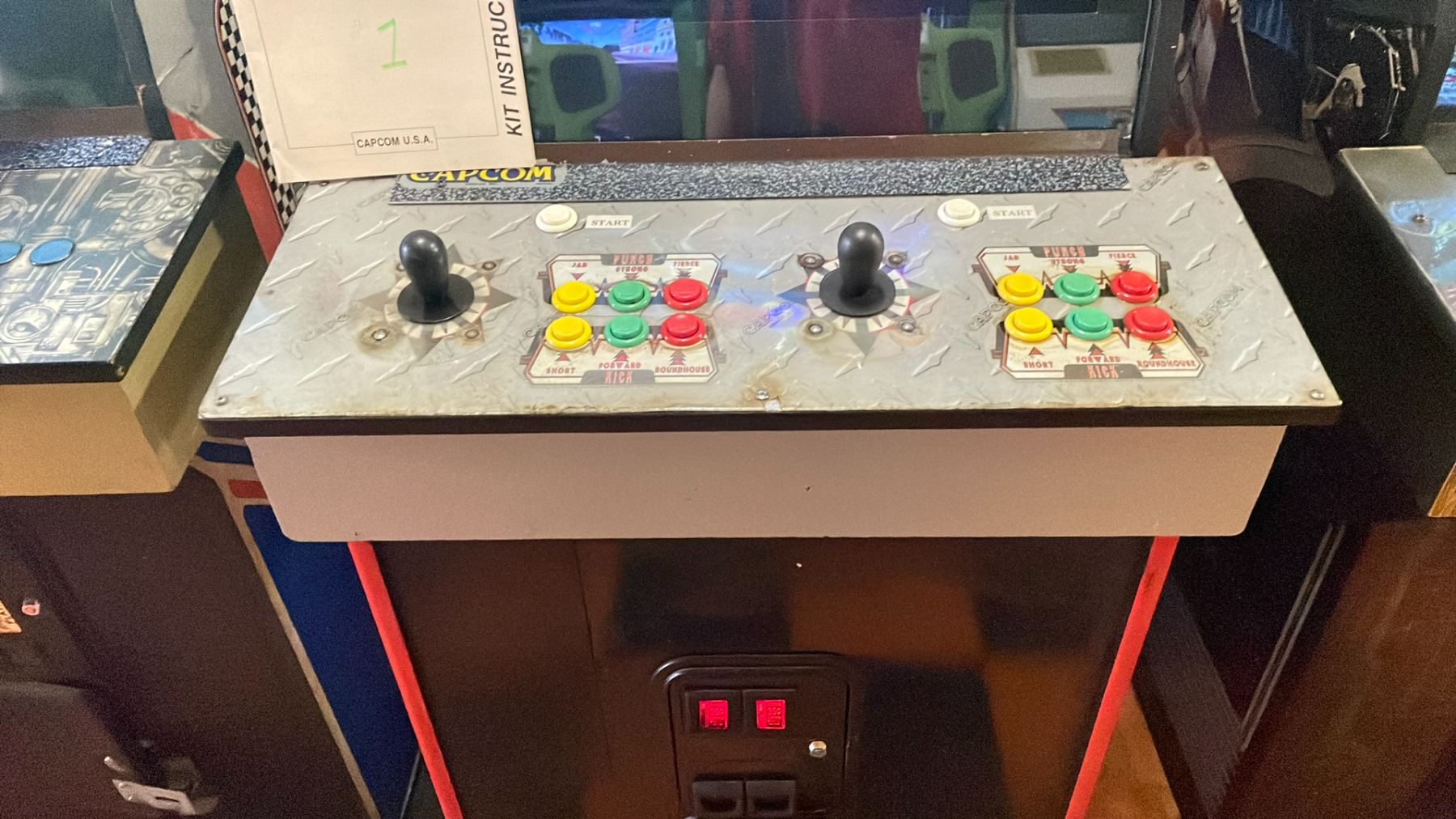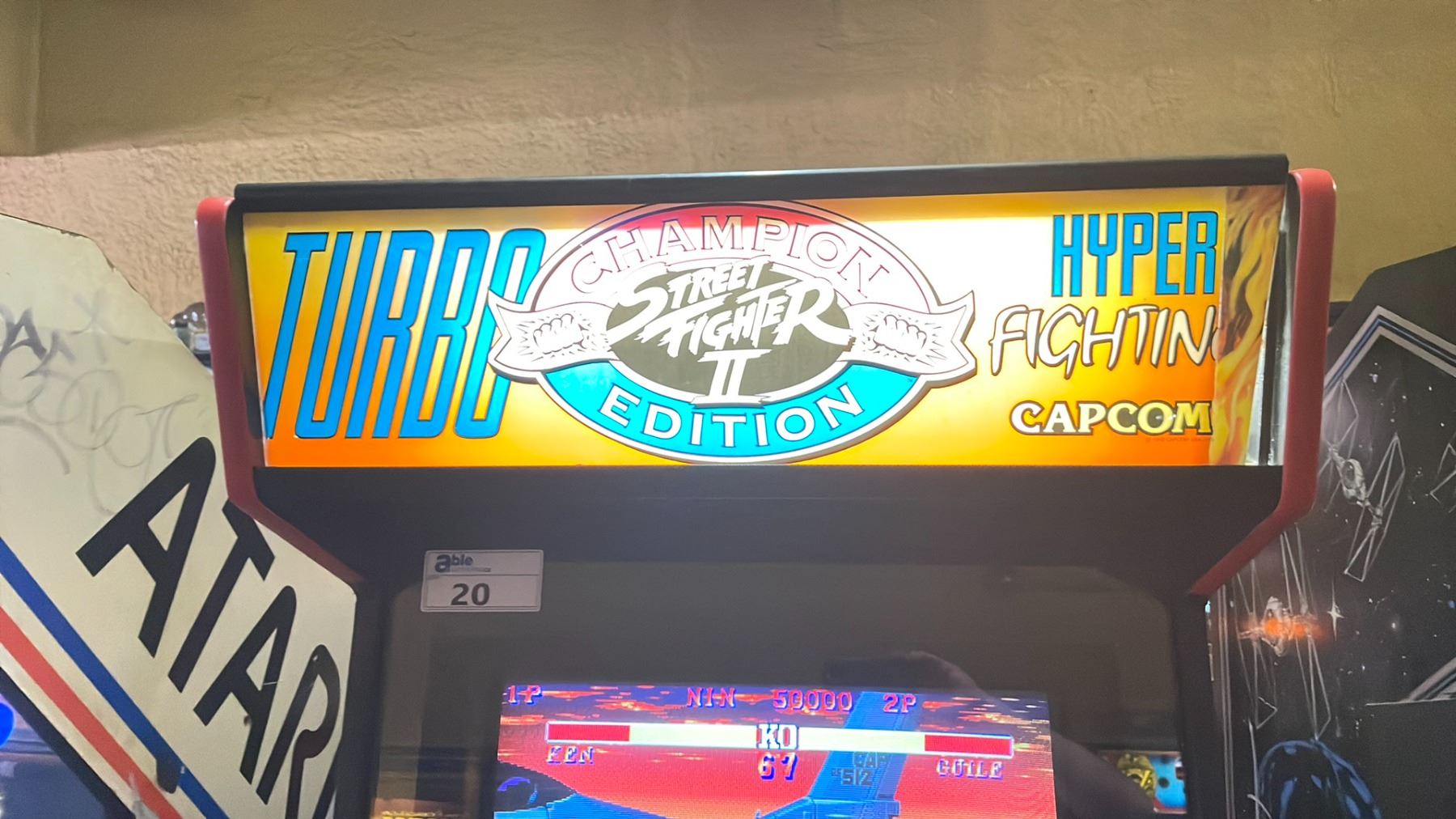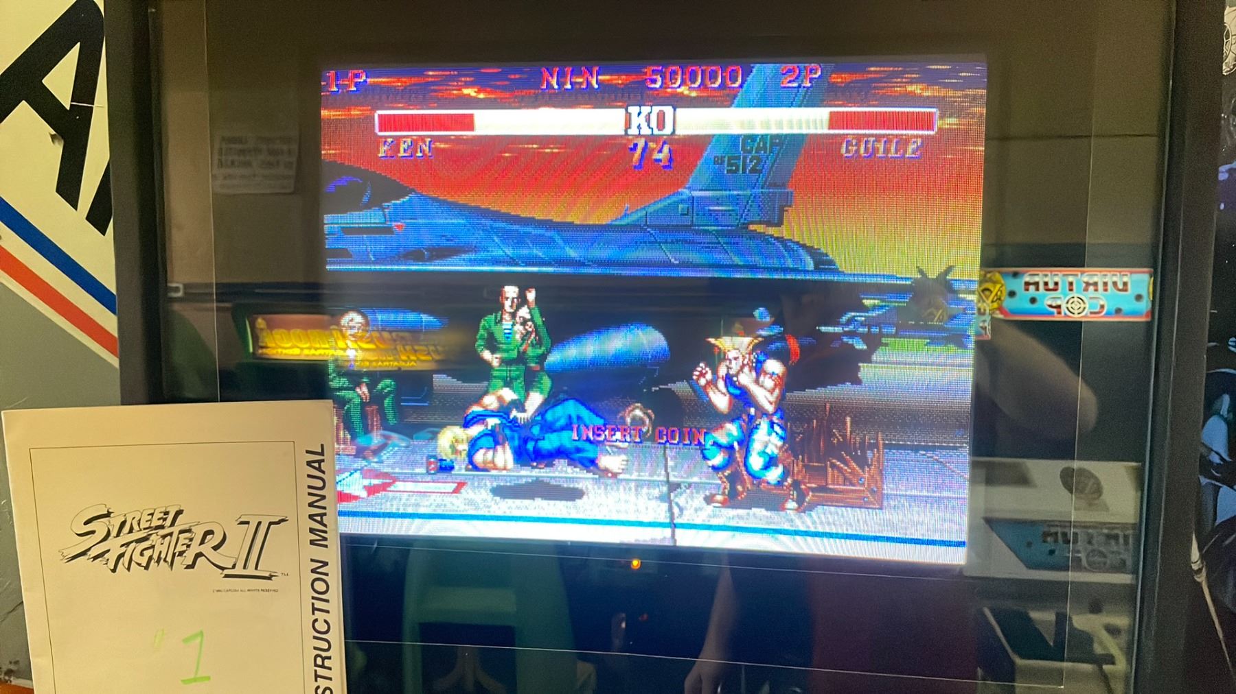 CAPCOM STREET FIGHTER II TURBO CHAMPION EDITION 2 PERSON COIN OPERATED UPRIGHT ARCADE GAME IN MIDWAY TERMINATOR 2 JUDGEMENT DAY CABINET WITH MANUALS