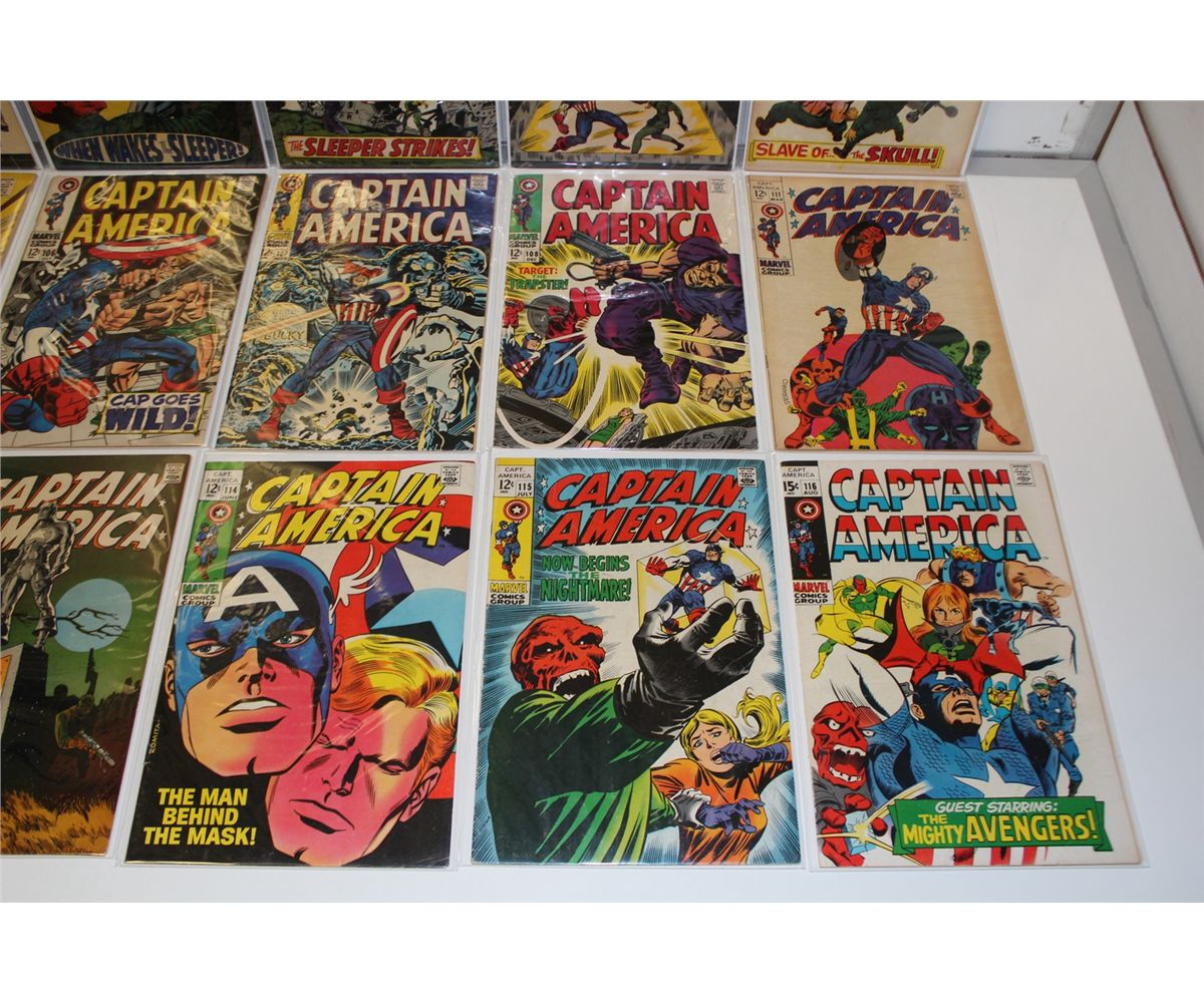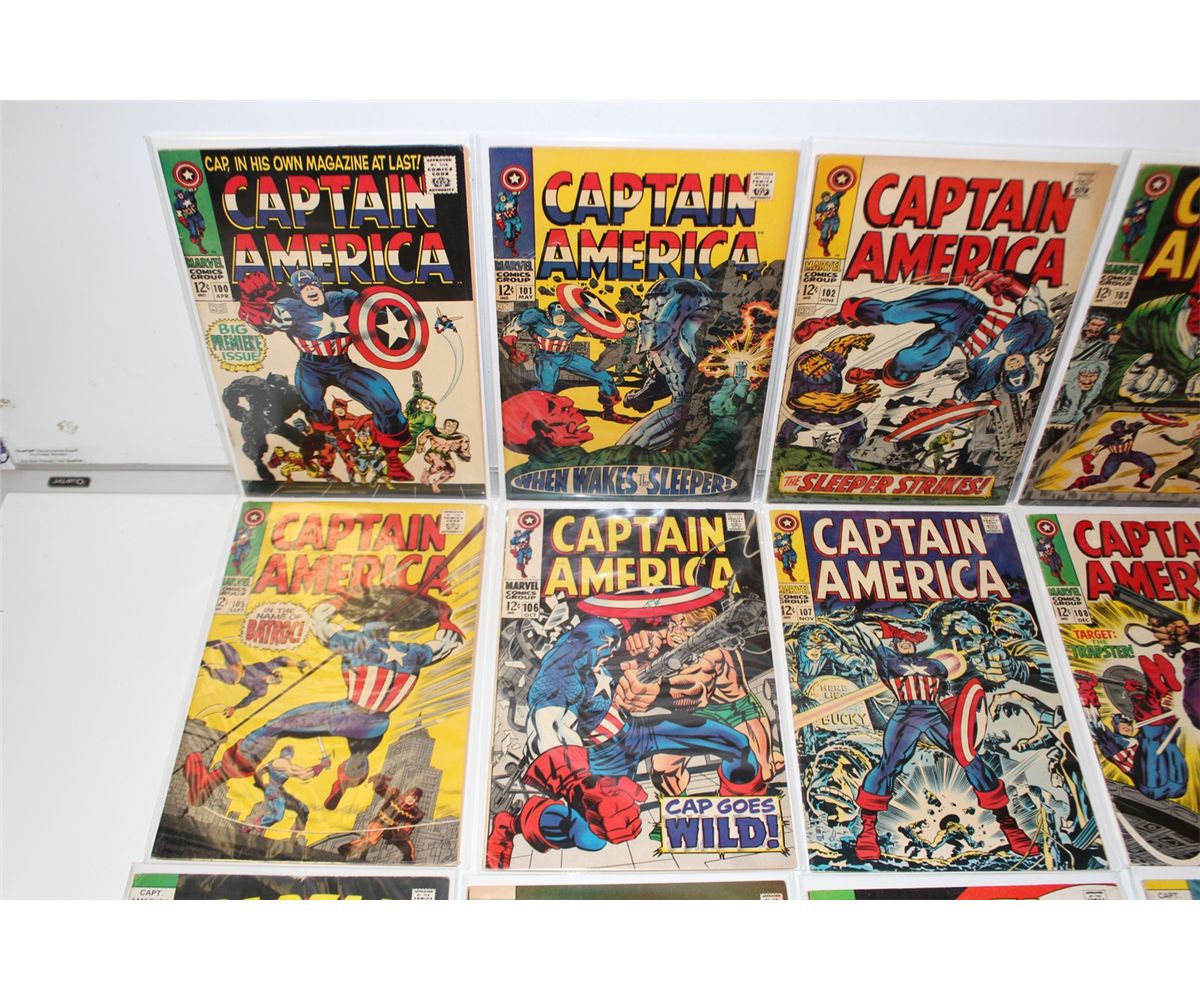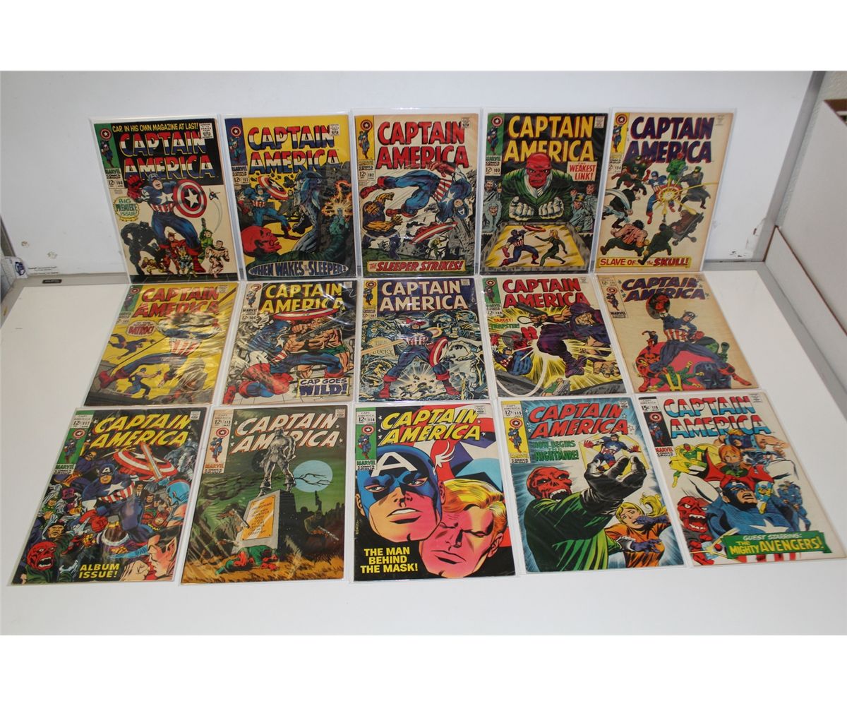 CAPTAIN AMERICA #100-108 & 111-116 (1968-69) NEAR COMPLETE SILVER CAP EARLY ISSUES RUN. 15 BOOKS TOTAL, SHARP MID GRADE AVG. #100-LOWER MID GRADE, MODERATE MOISTURE, RUST MIGRATION. #101-116 PRESENT NICE, TANNING/BROWNING ON COVERS, FLAT, TIGHT & SUPPLE
