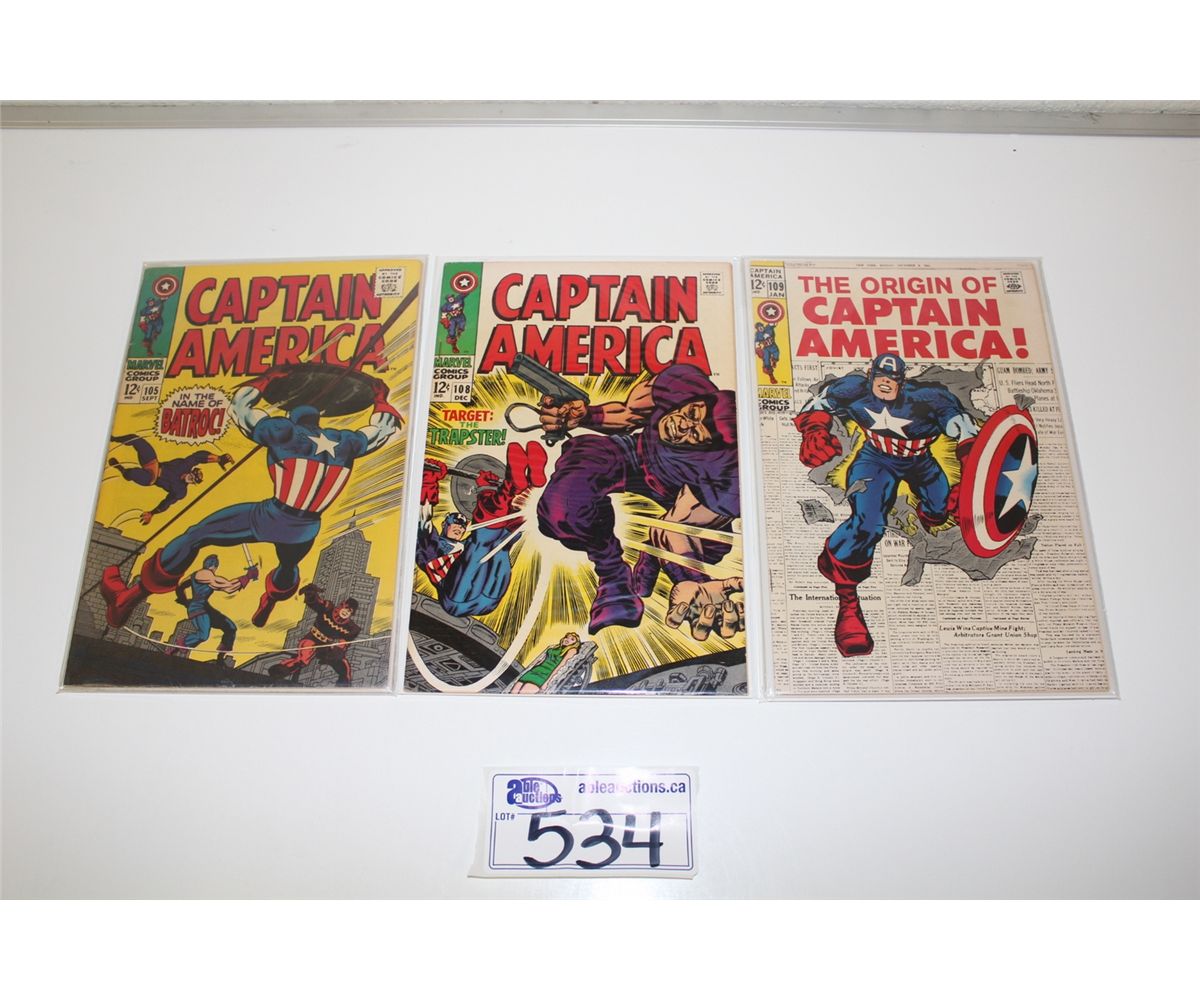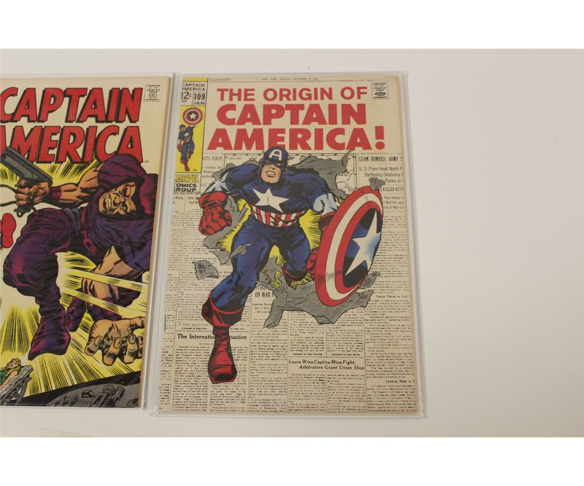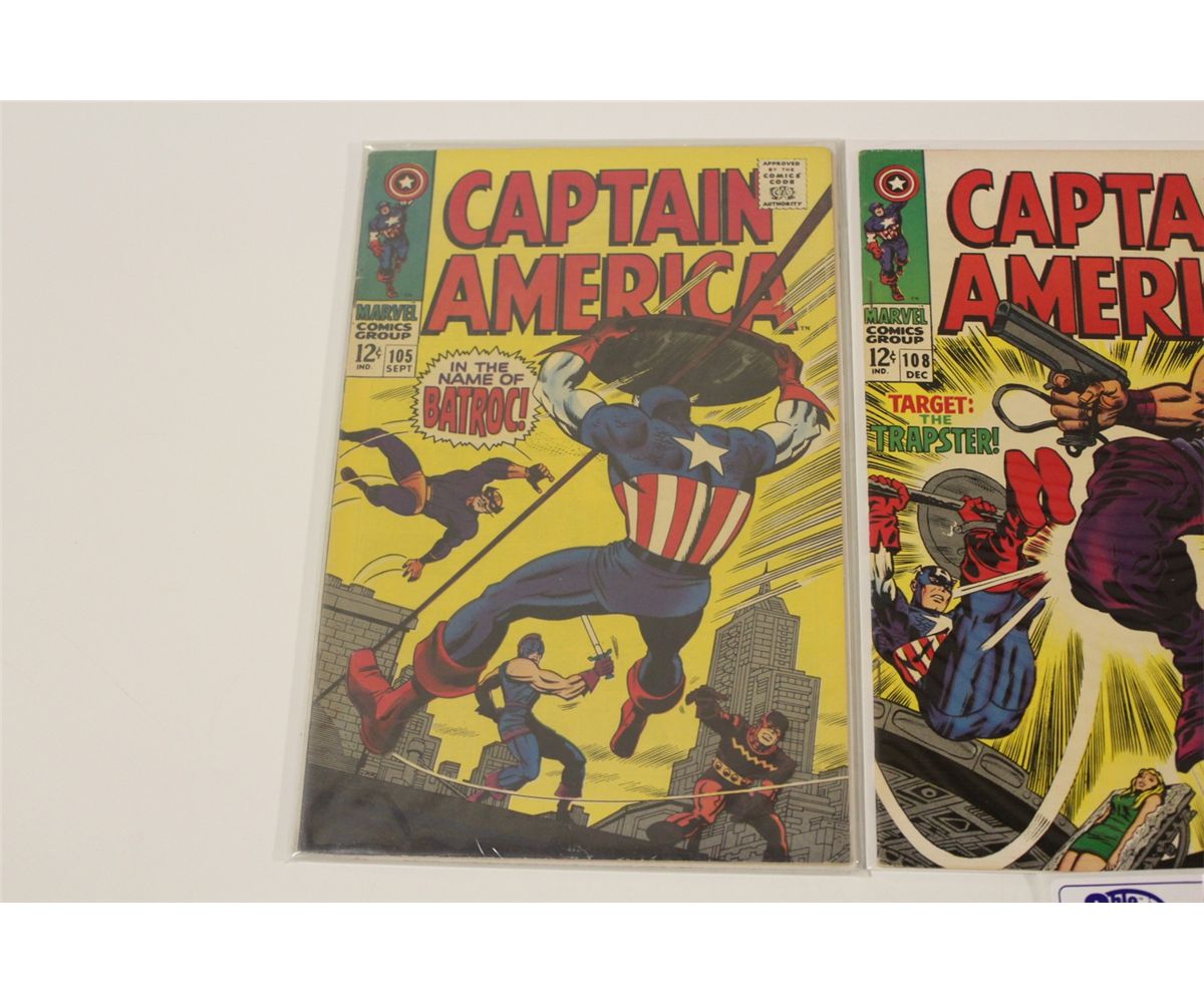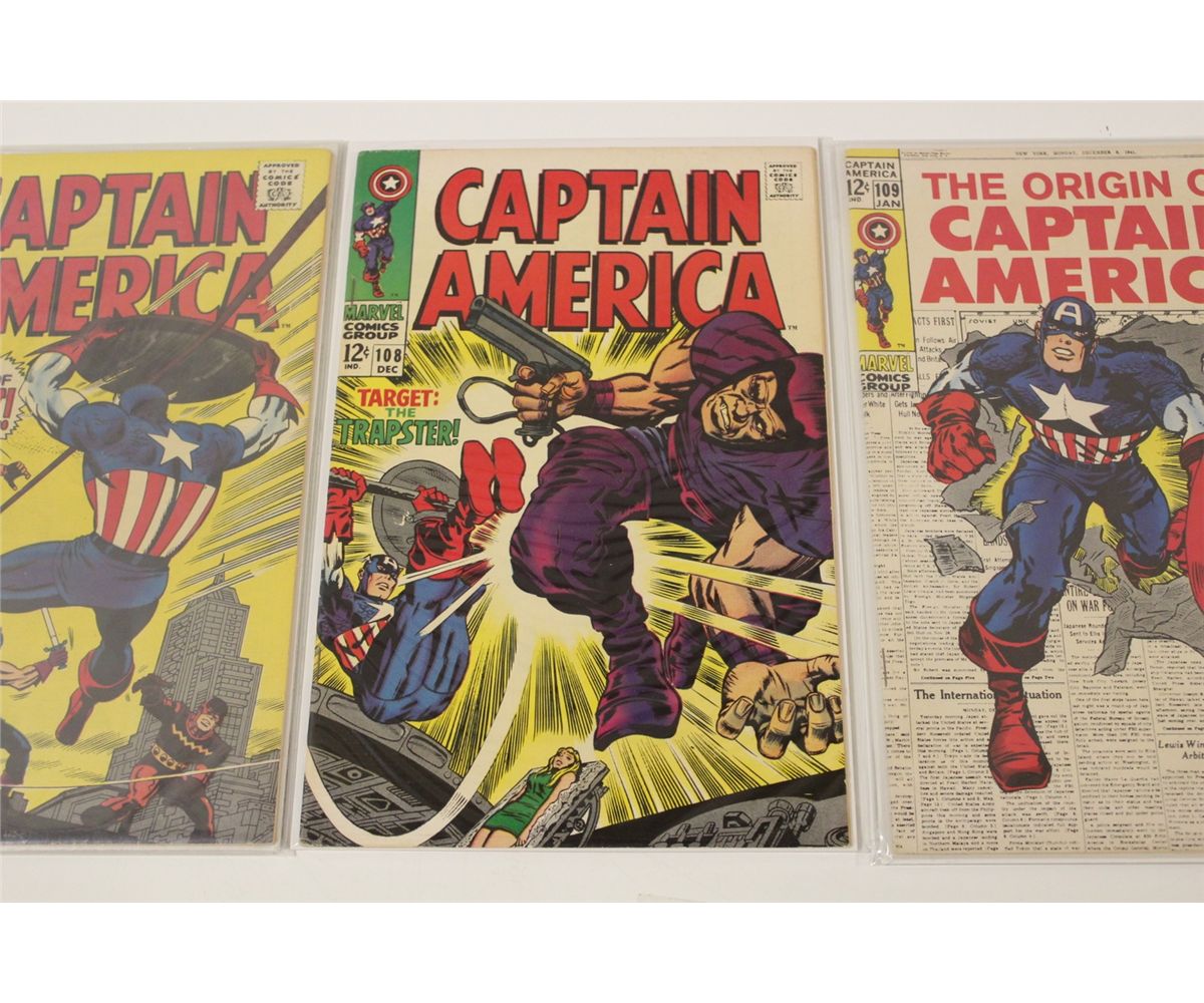 CAPTAIN AMERICA #105, 108 & 109 (1968-69) #109 - ORIGIN RETOLD. HIGHER MID GRADE AVERAGE, GLOSSY TIGHT & SUPPLE. EXCELLENT COPIES!