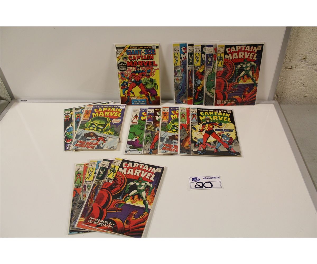 CAPTAIN MARVEL #12-40 PLUS GIANT SIZE CAPTAIN MARVEL #1 (1975). PLUS #12-21 CONSECUTIVE. SOLID MID GRADE AVERAGE. 18 BOOKS TOTAL.