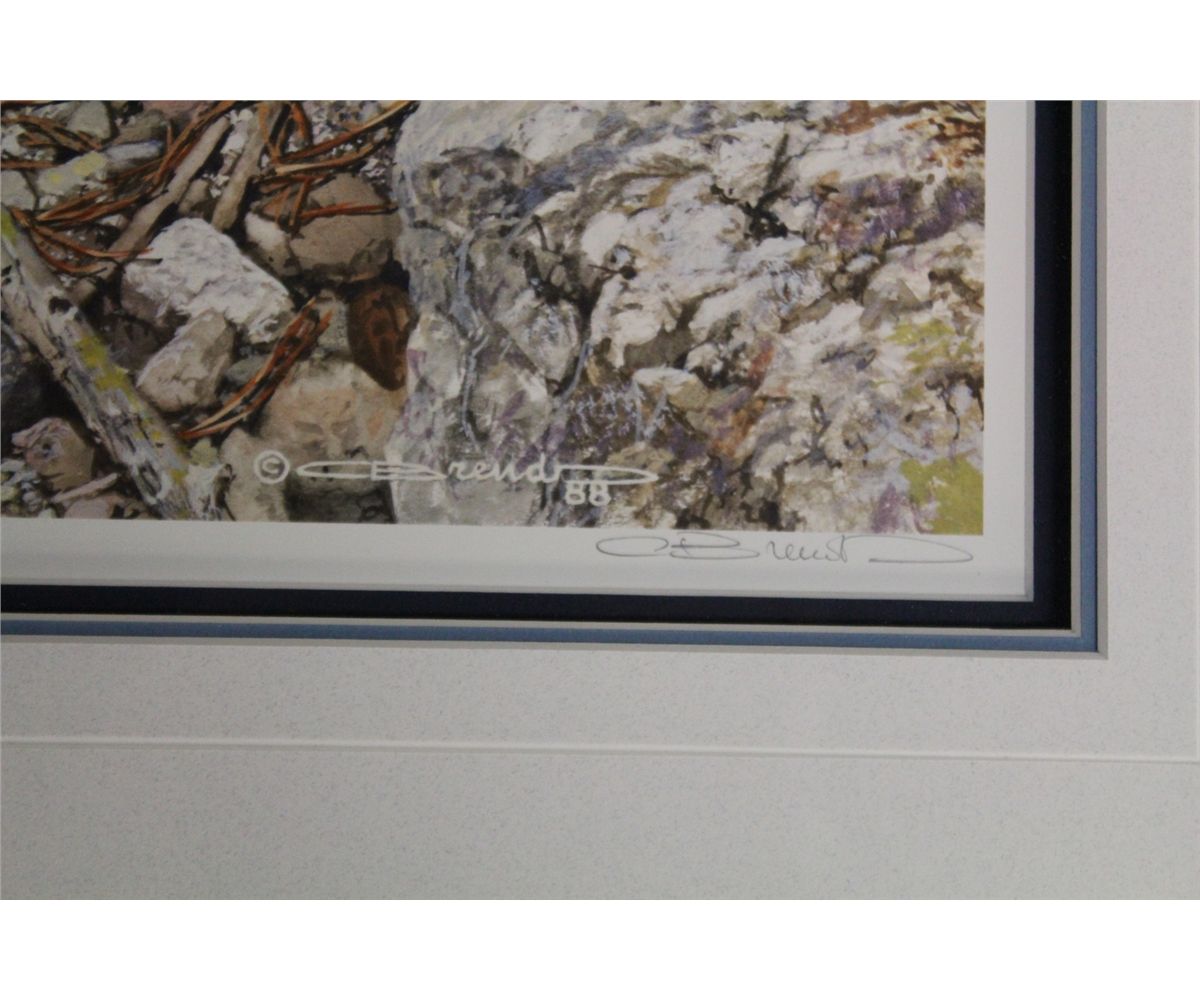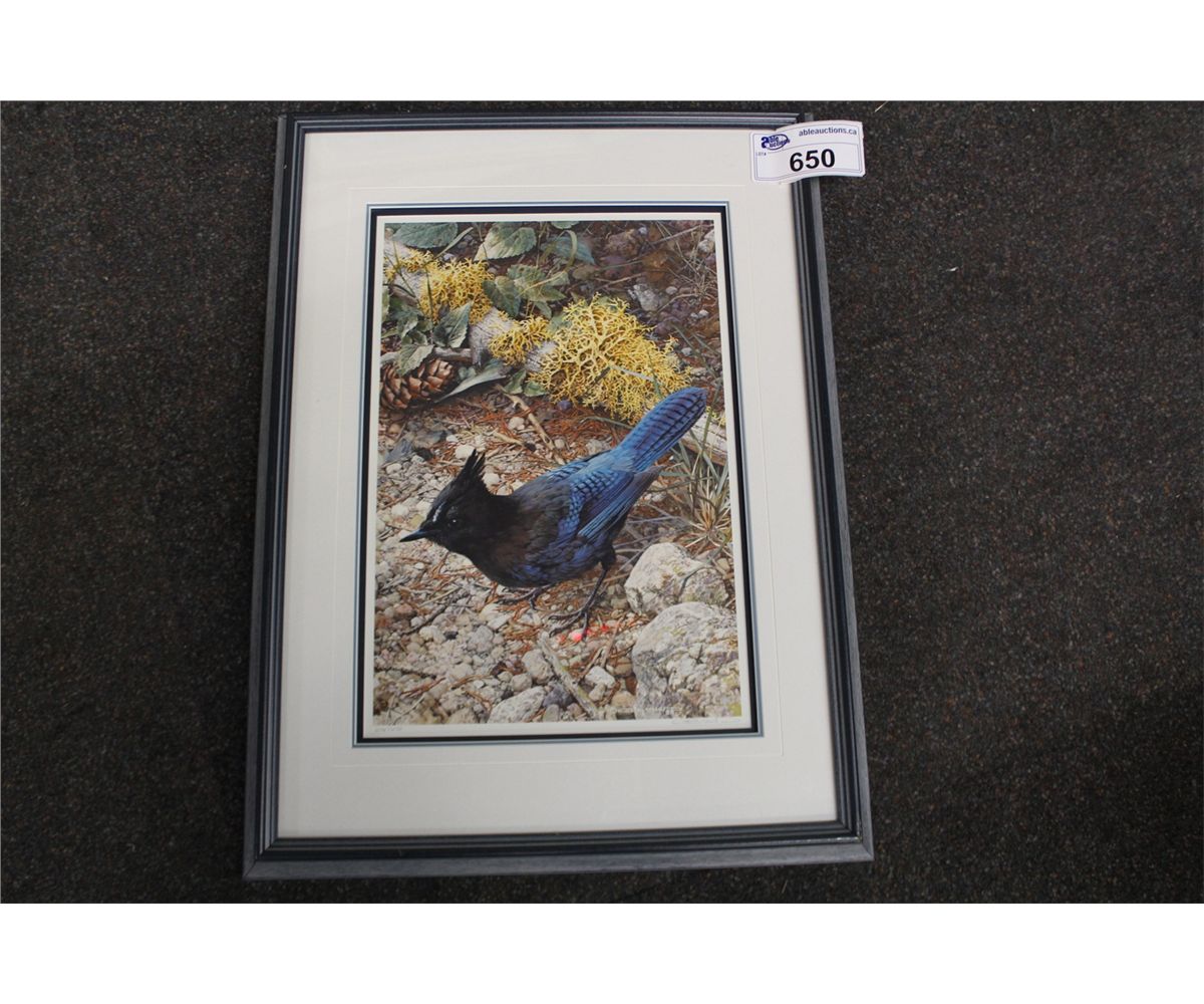 CARL BRENDERS "STELLER'S JAY" LIMITED EDITION FRAMED PRINT, SIGNED LOWER RIGHT 11" X 17" 1238/1250 SIGNED LOWER RIGHT- ALL NET PROCEEDS FROM THE SALE OF THIS ARTWORK WILL BE DONATED TO THE SQUAMISH FOOD BANK