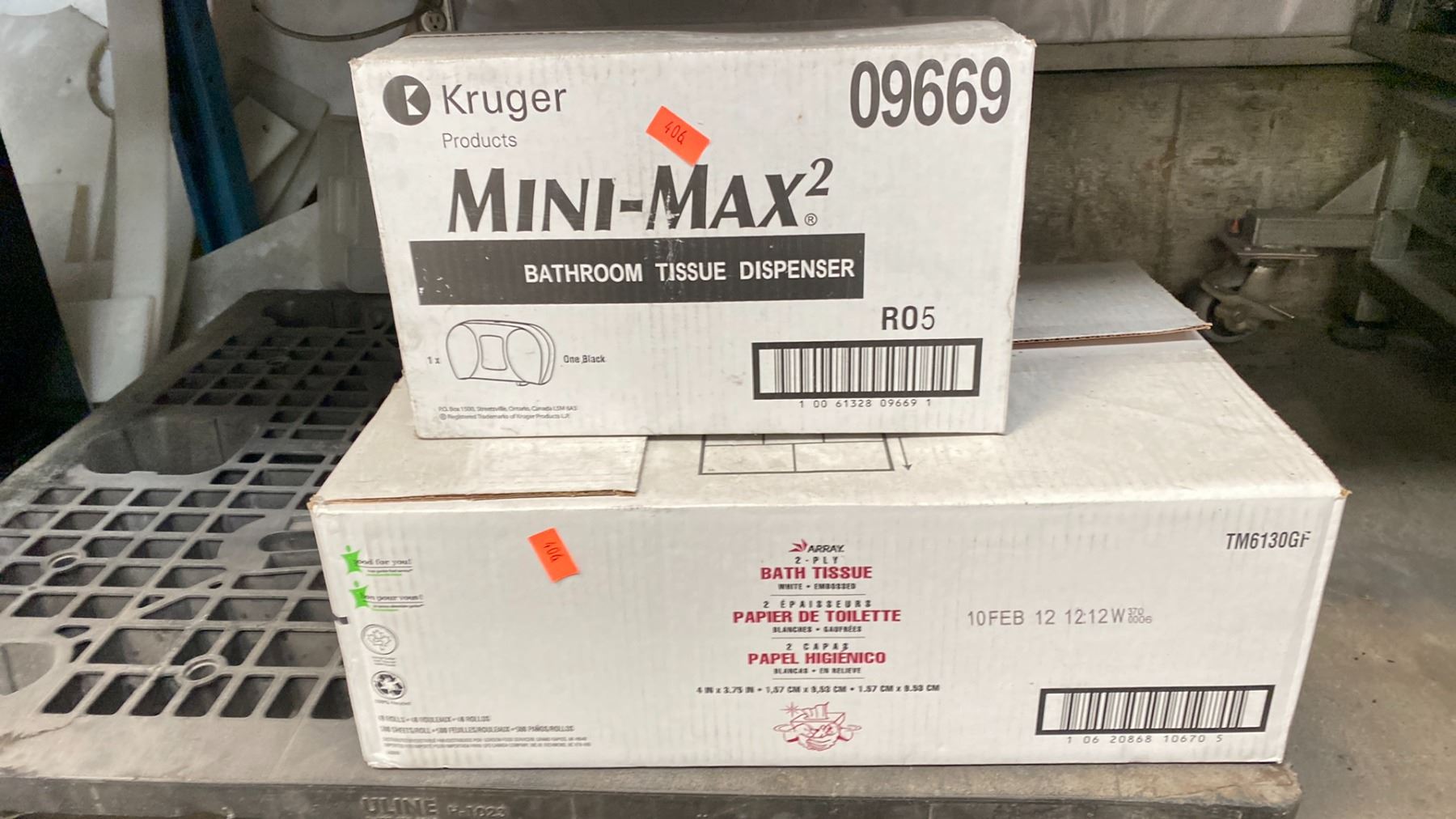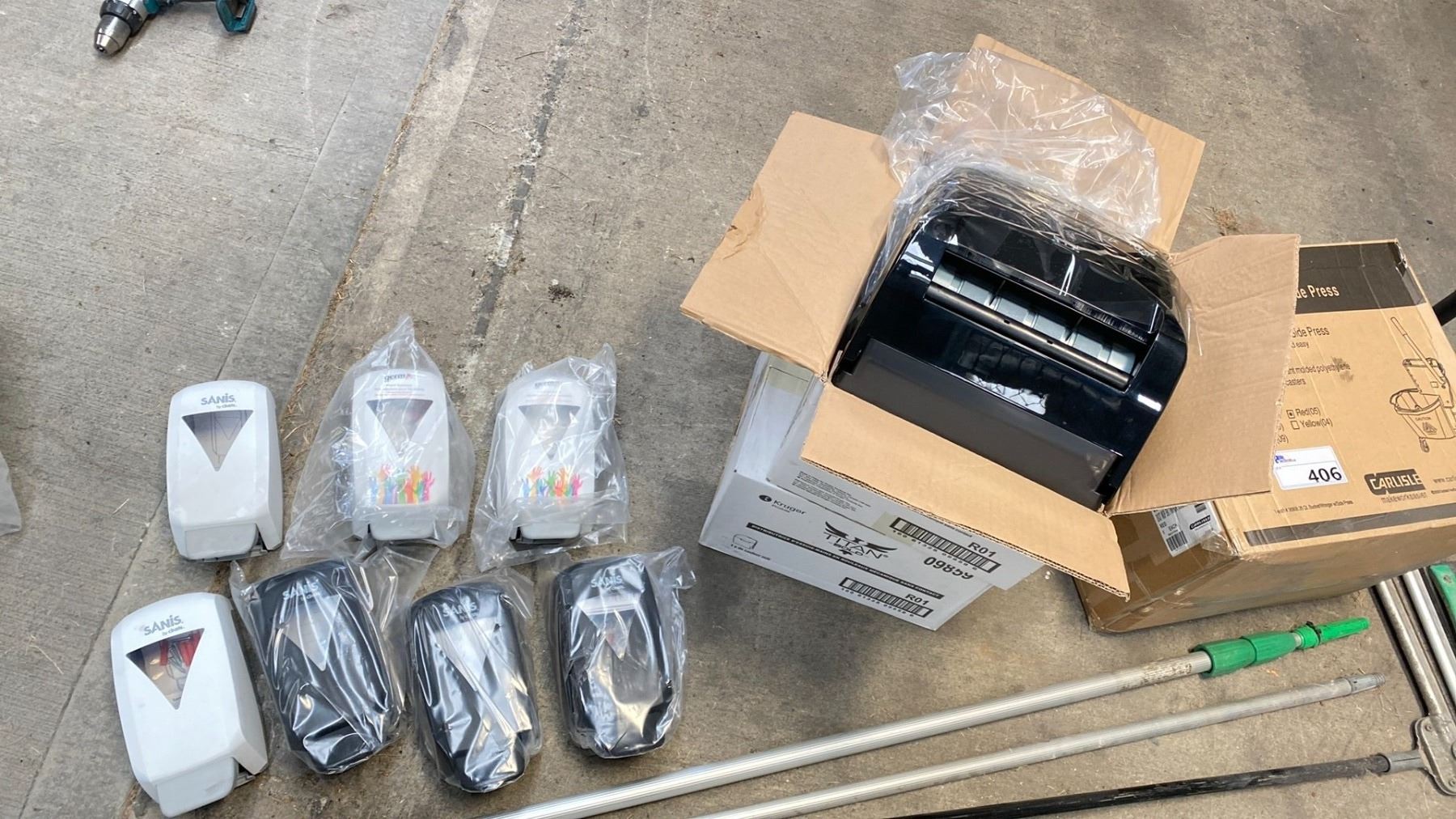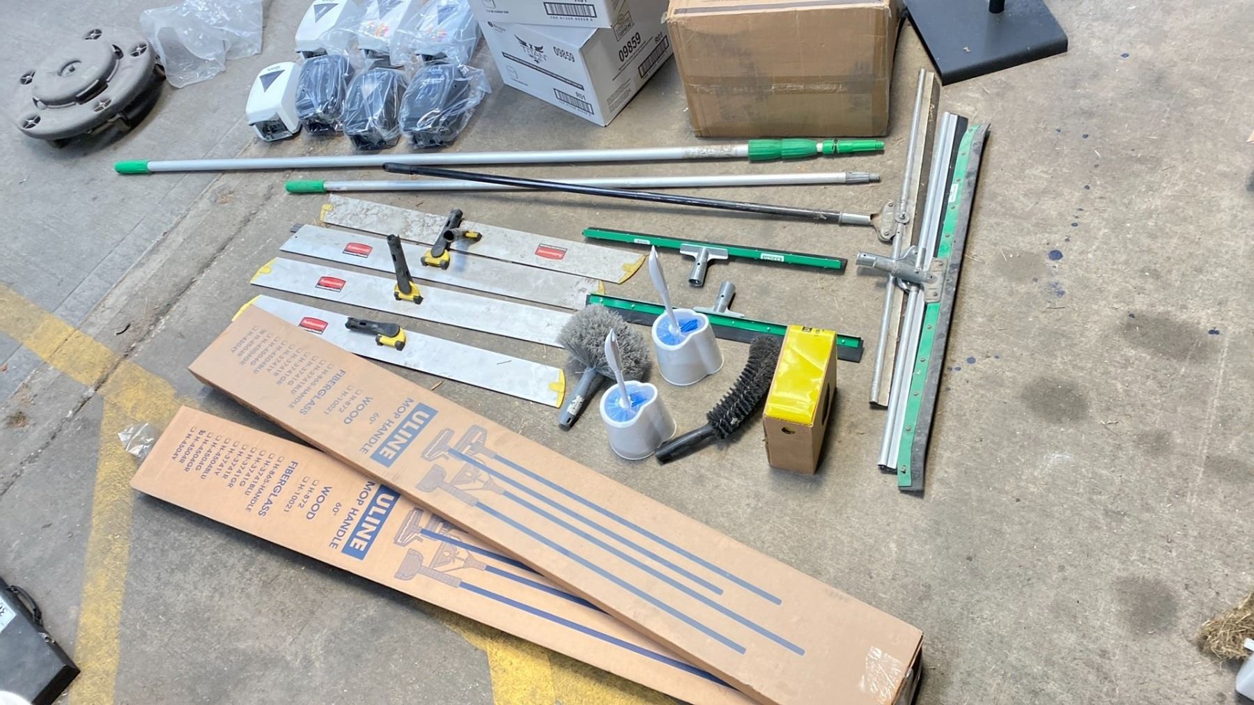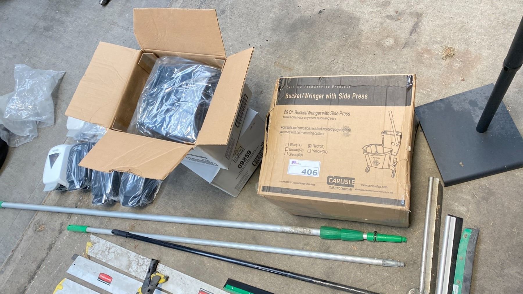 CARLISLE 26 QT RINGER BUCKET NEW IN BOX-RED PLUS RUBBERMAID MOP HANDLES, RUBBERMAID VELCRO MOP HEADS, SQUEEGEES (4), TOILET BRUSHES, SOAP DISPENSERS, GERMX HAND SANITIZERS, ULINE YELLOW TAPE, TOILET PAPER, PAPER DISPENSERS, TOWEL DISPENSERS, DUST PANS, ETC