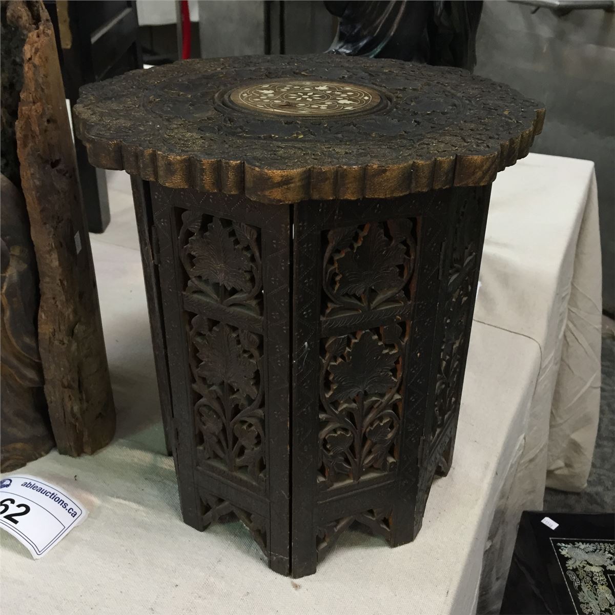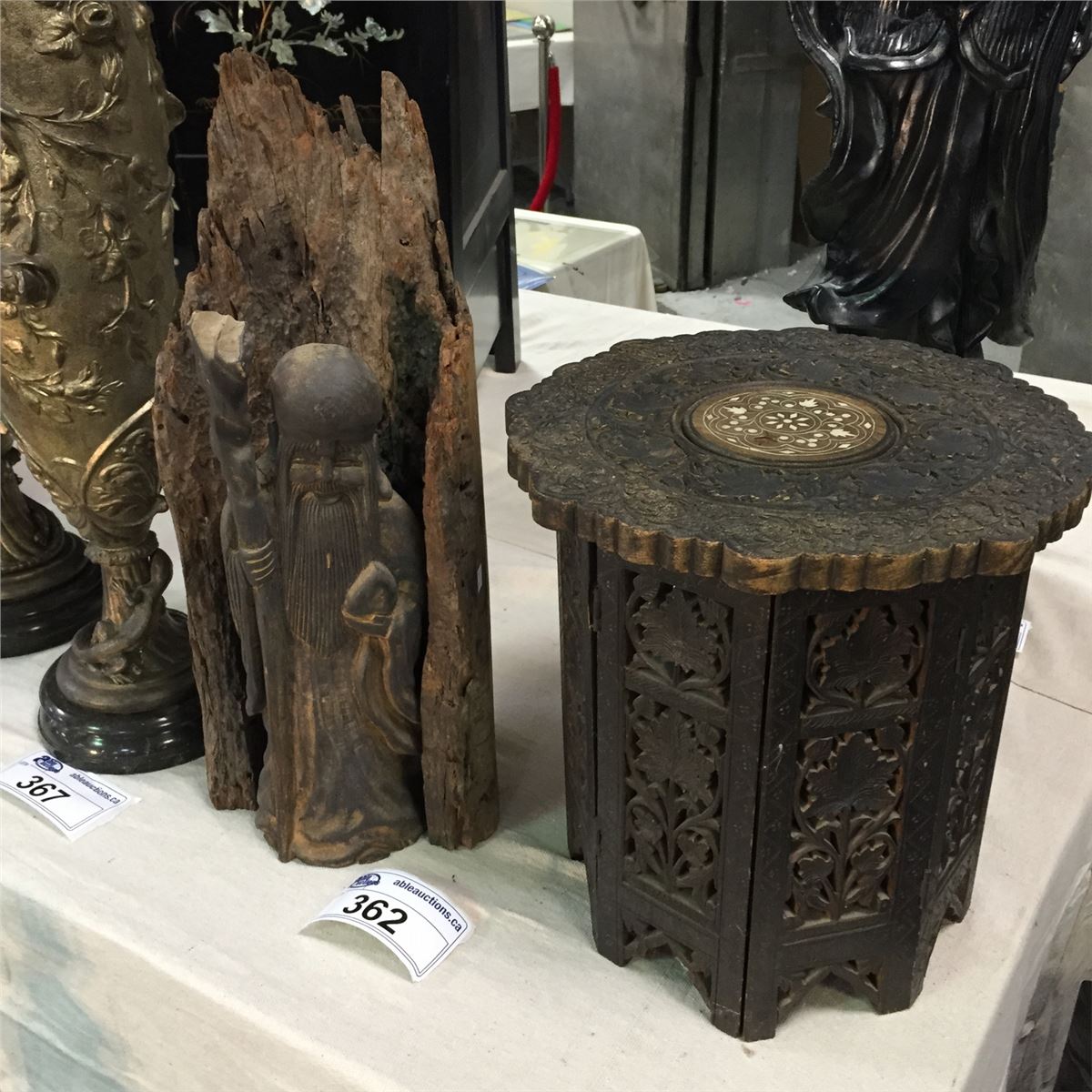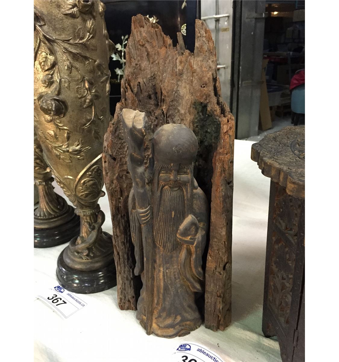 CARVED ASIAN MAN IN STUMP AND 8 PANEL SCREEN