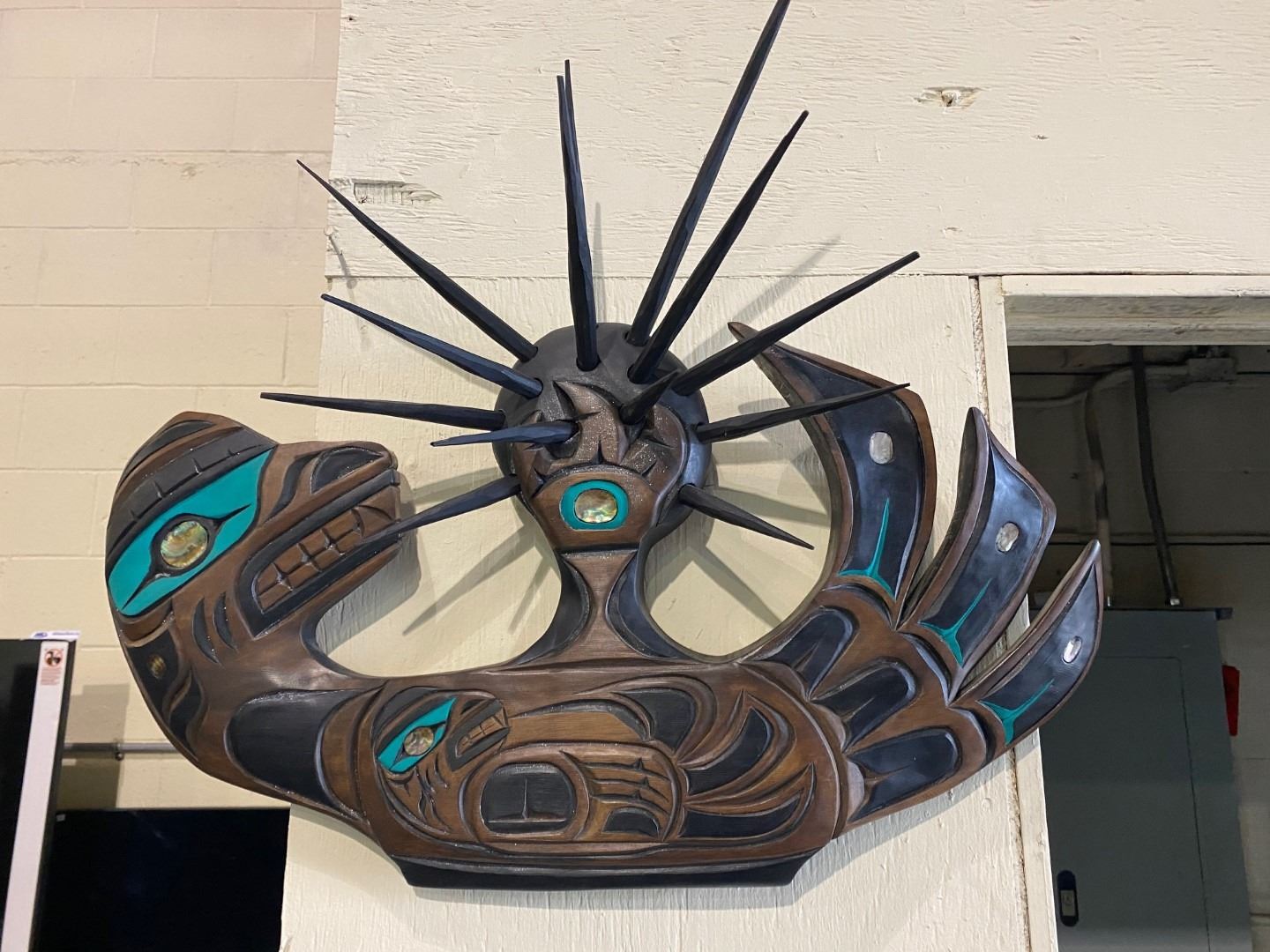 CARVED FIRST NATIONS WALL PLAQUE TITLED "SEA OTTER" SIGNED ON BACK WITH ABALONE INLAY APPROX 28" X 16"
