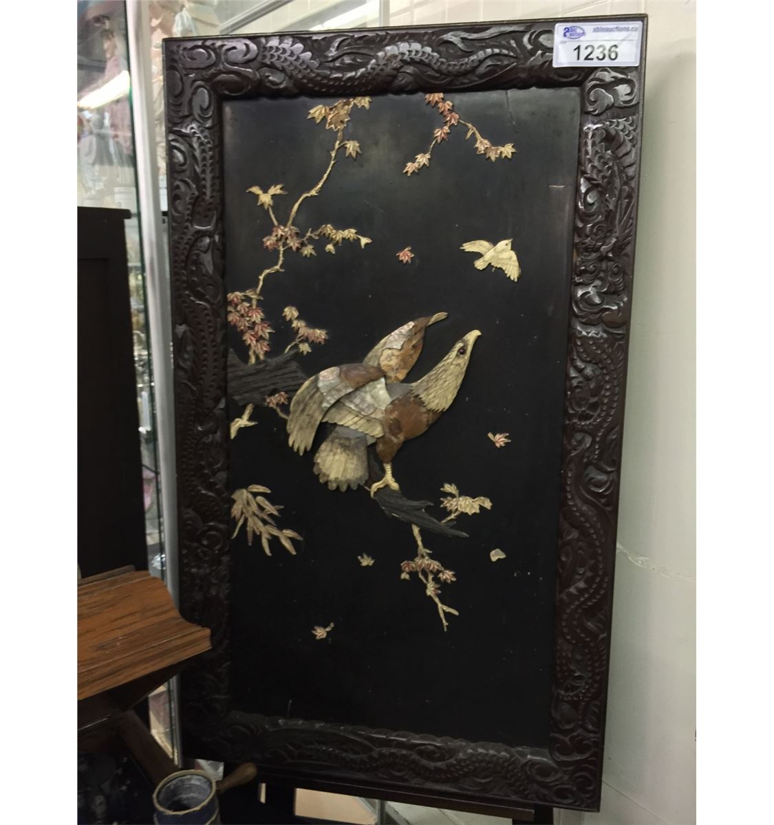 CARVED FRAME PICTURESQUE CARVING OF RAVENS W/ SHELL INLAY