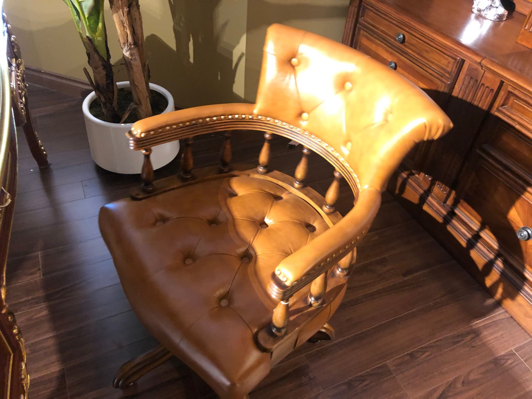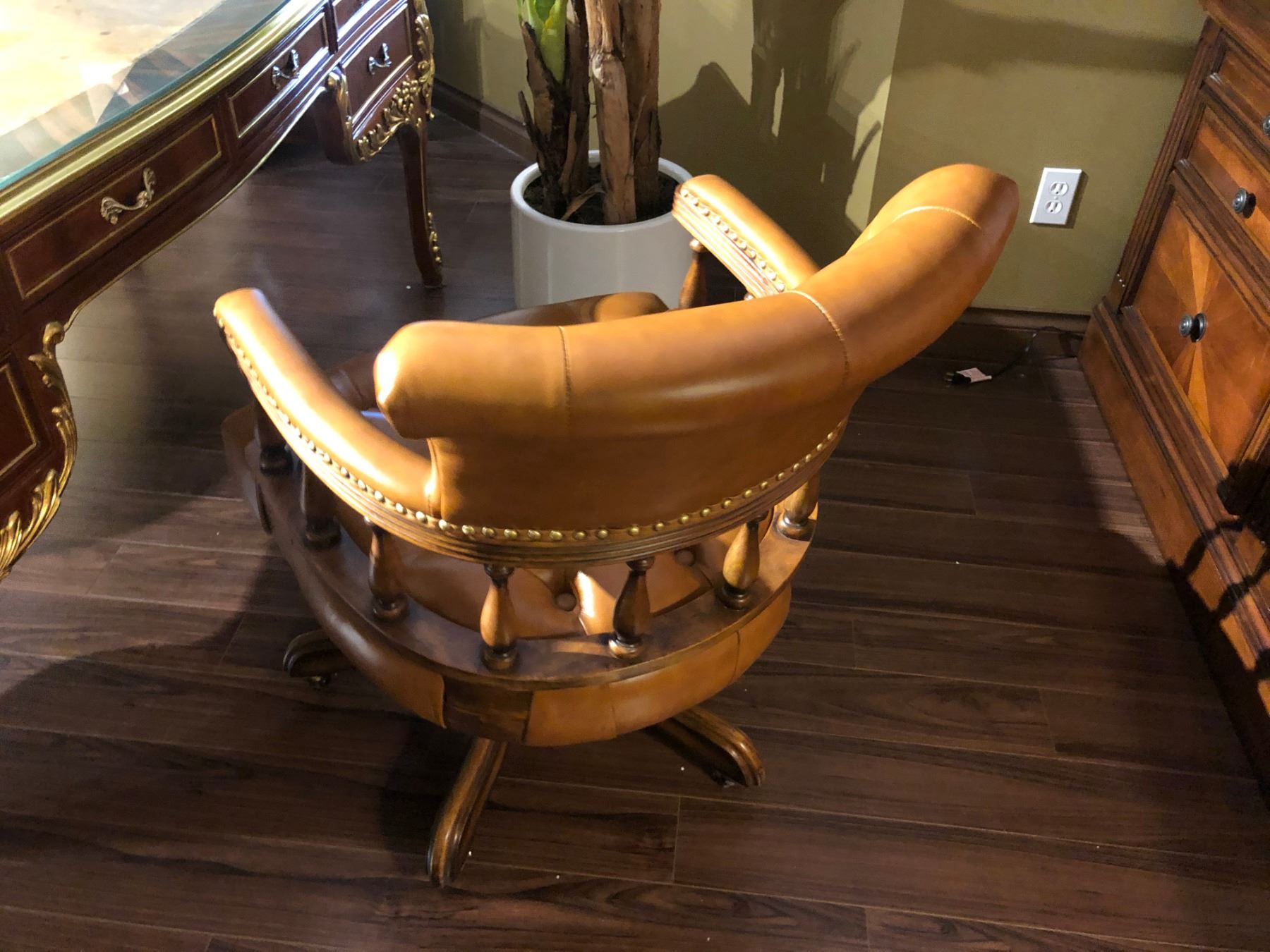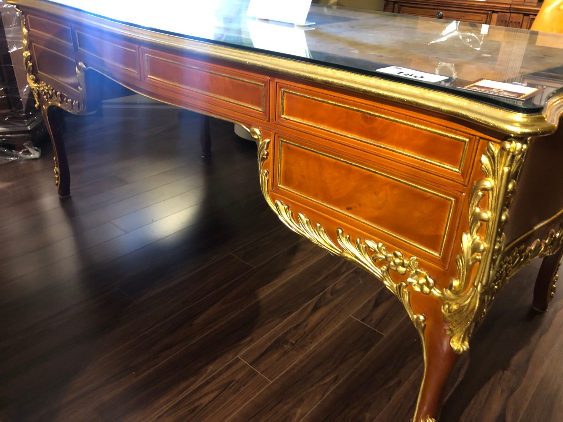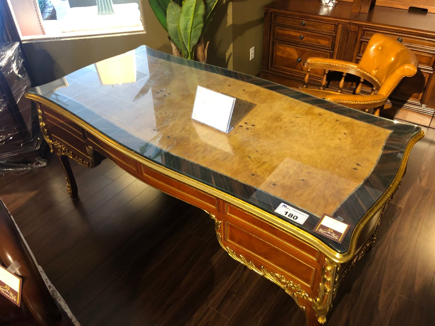 CARVED / INLAYED BURLED TOP EXECUTIVE DESK WITH LEATHER SWIVEL CHAIR. RETAIL $7,350.00