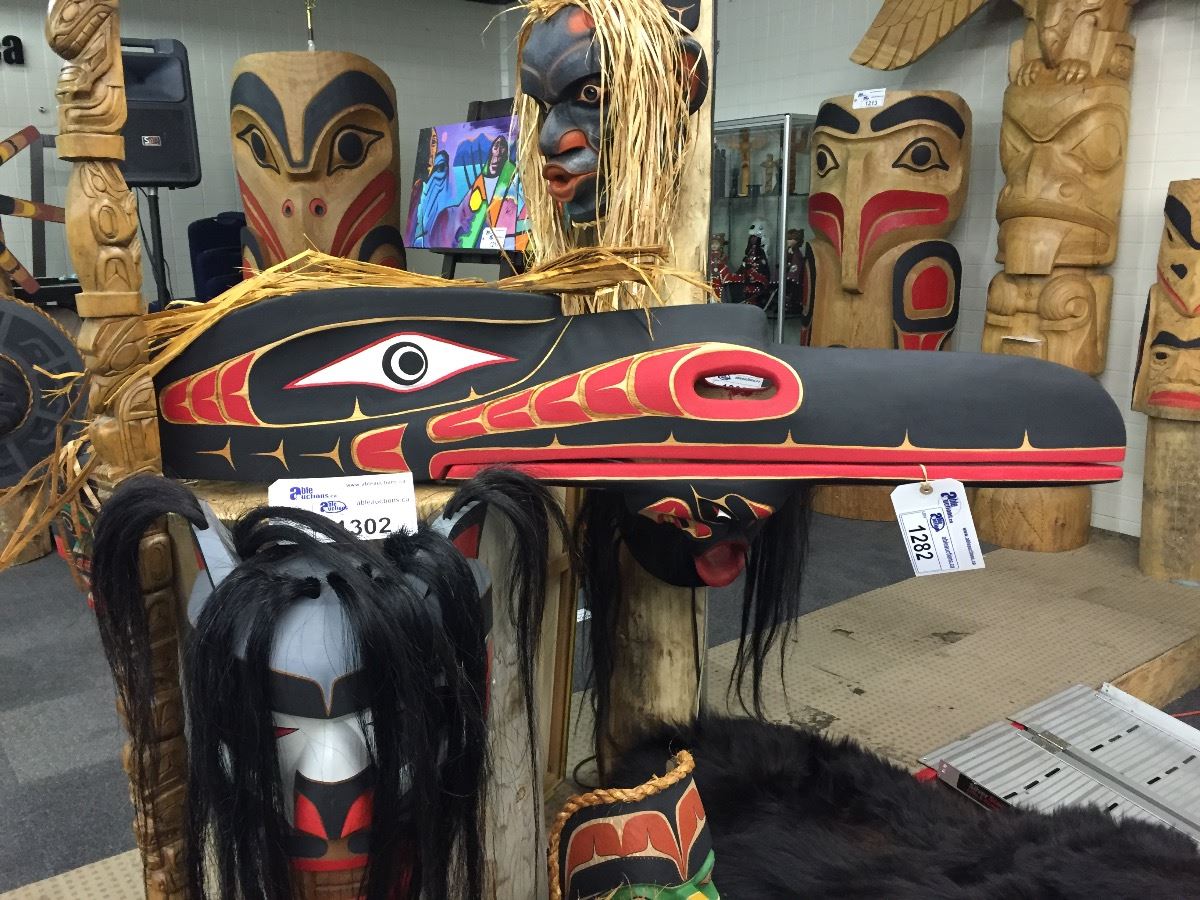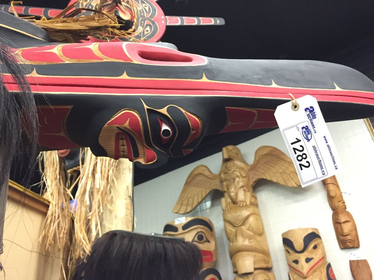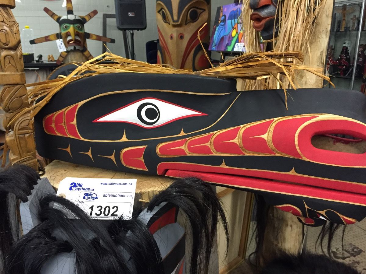 CARVED / PAINTED RAVEN MASK WITH ARTICULATING BEEK AND HAWK MAN PORTRAIT ON UNDERSIDE BY EMIL THIEBERT, 43"L  9 1/2"T  11"W