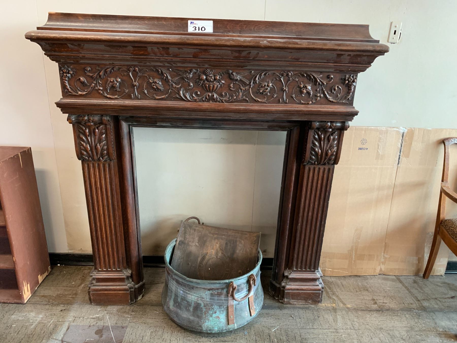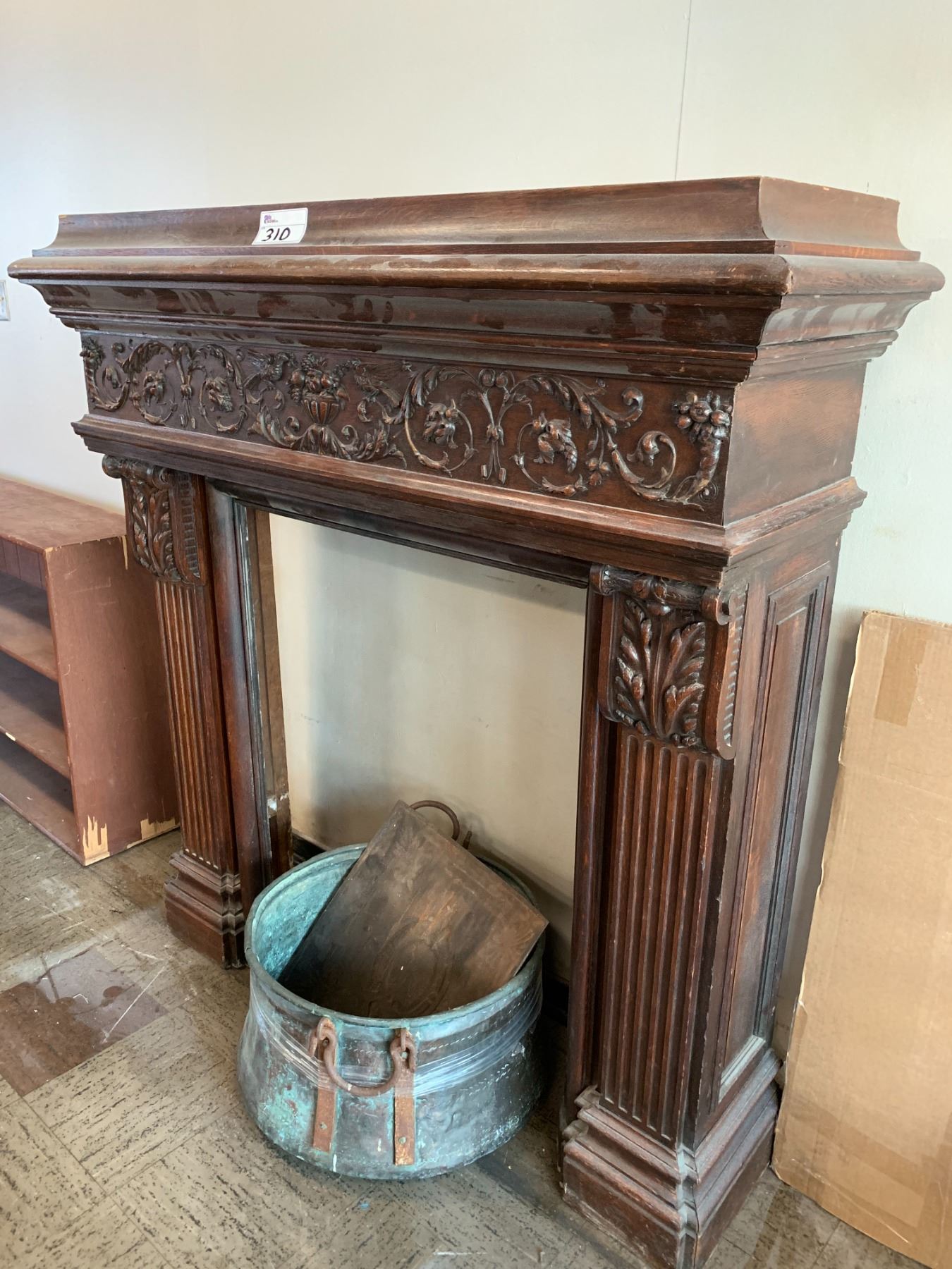 CARVED WOOD MANTLE APPROX 60"X57"X18", METAL BUCKET & METAL FIREWOOD HOLDER