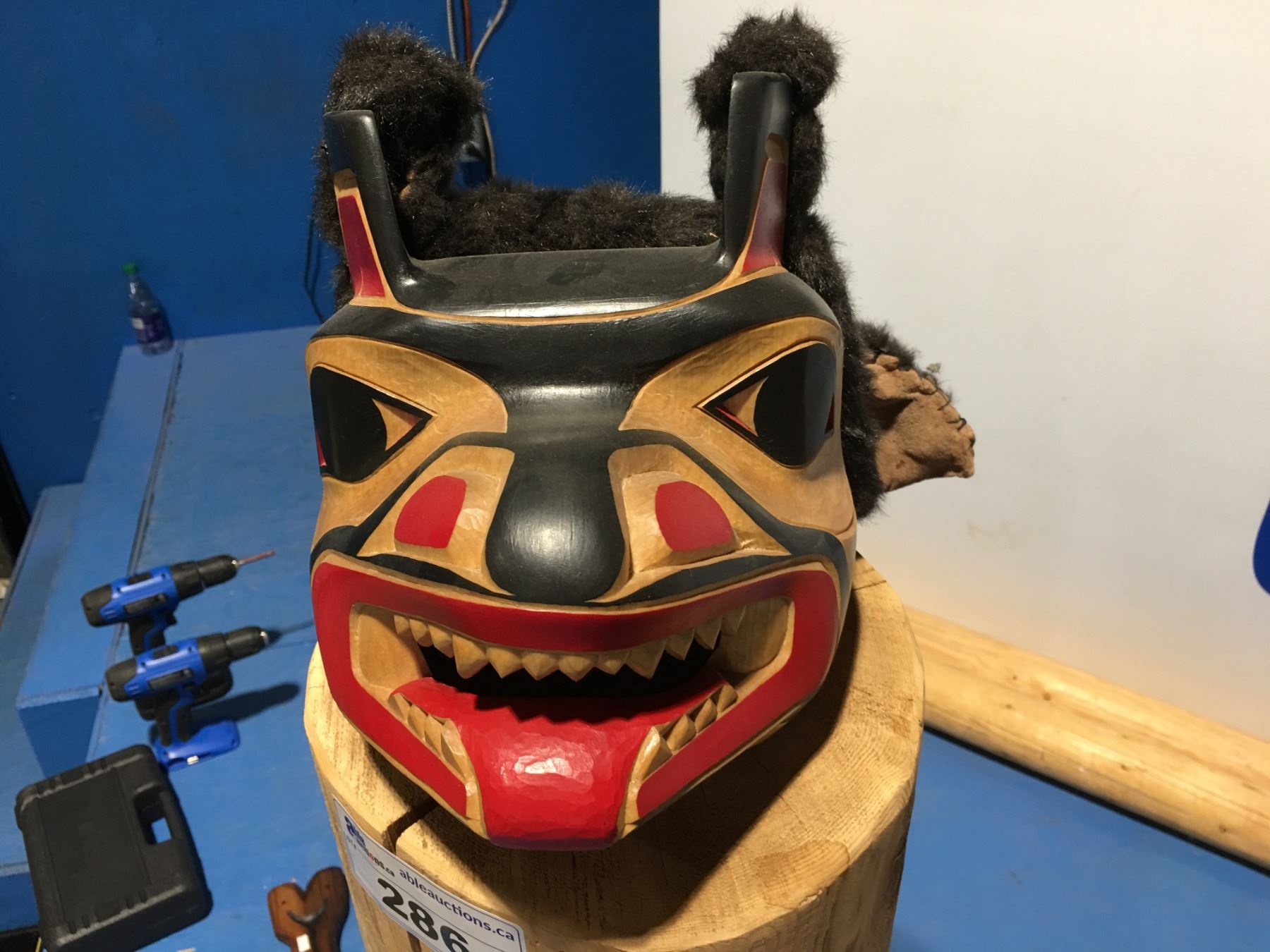 CARVED YELLOW CEDAR BEAR DANCER FRONT LIT MASK BY RUPERT JEFFREY (9" X 9")