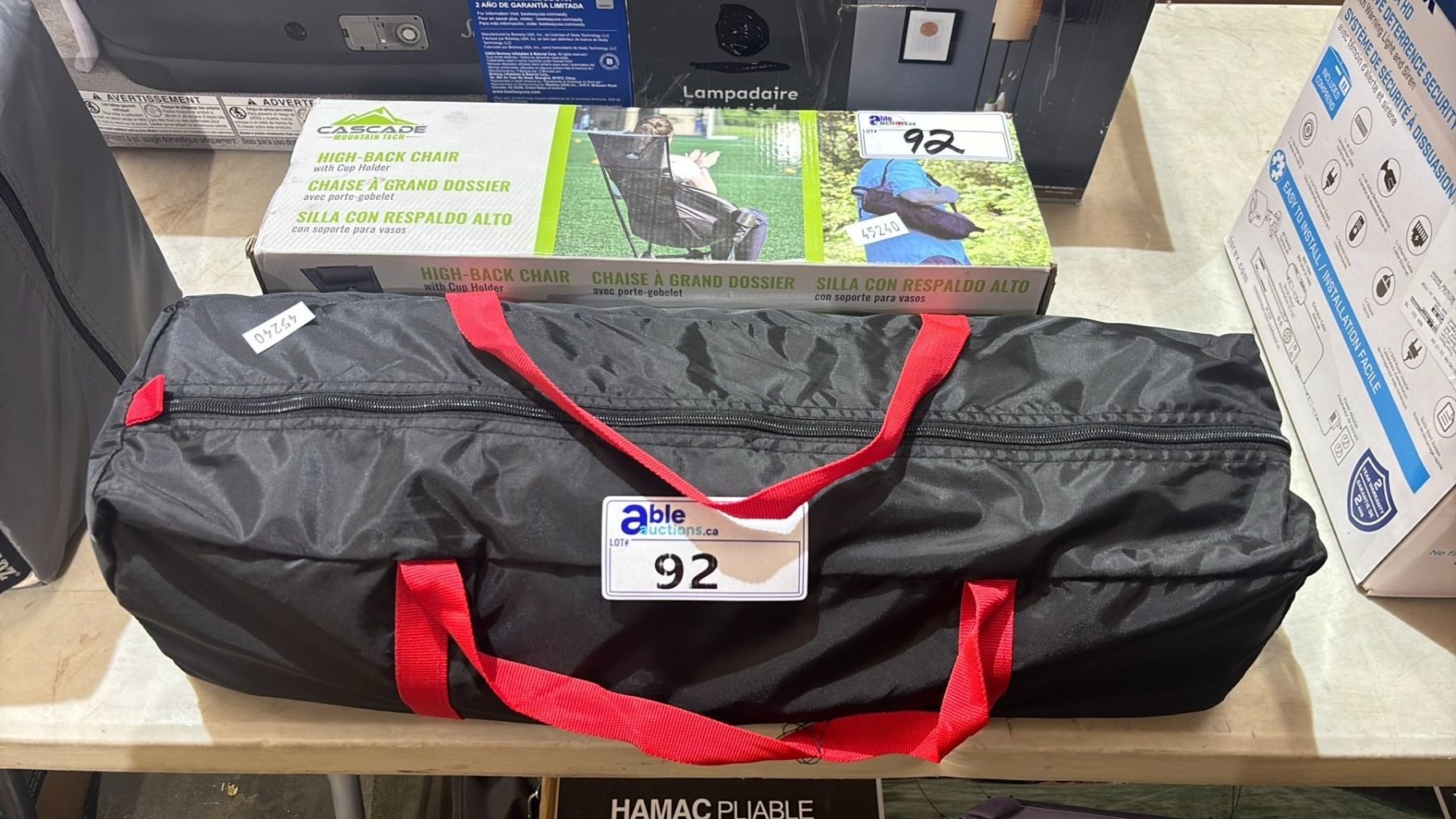CASCADE MOUNTAIN TECH HIGH-BACK CHAIR WITH CUP HOLDER & A COLEMAN TENT IN A SOFT TRANSPORT BAG *WORKING CONDITION UNKNOWN/MAY BE MISSING PARTS AND/OR PIECES*