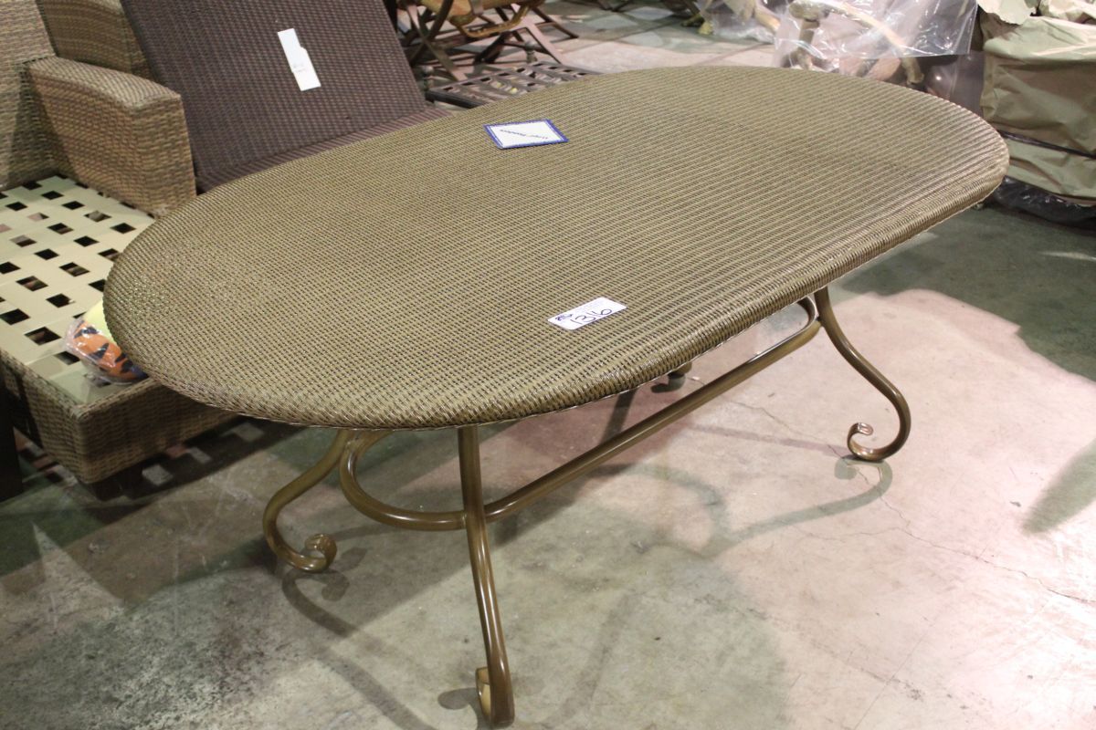 CAST METAL AND BROWN RATTAN PATIO TABLE