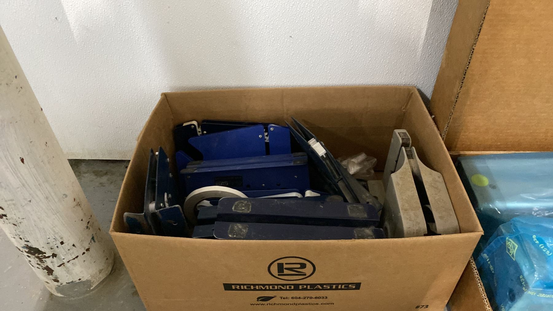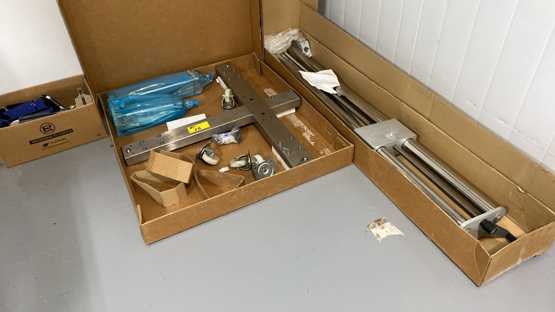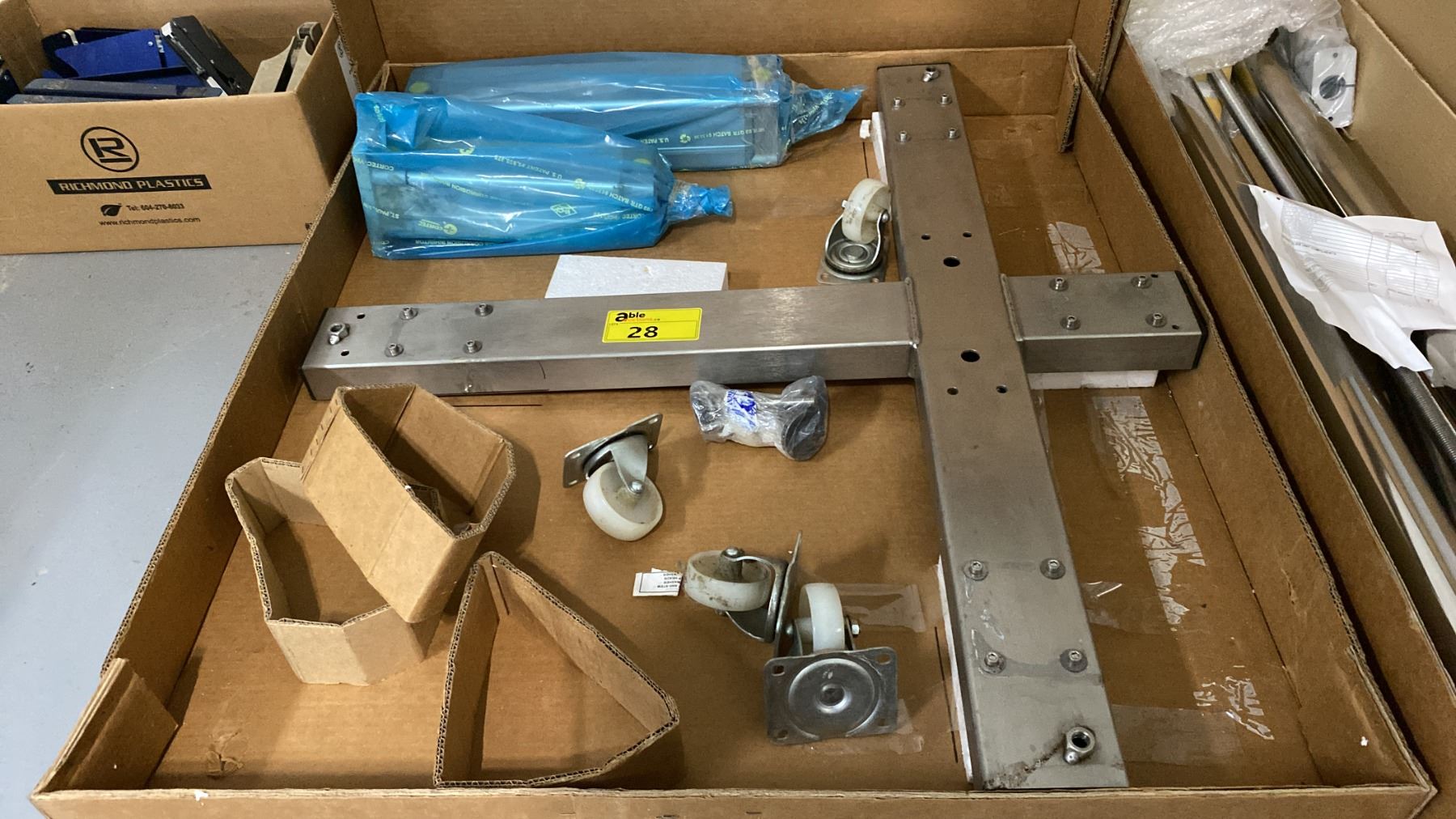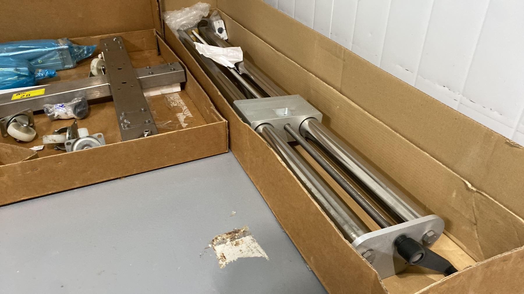 CASTLE ENGINEERING STAINLESS STEEL COMMERCIAL MOBILE TUBE LIFTER WITH BOX OF COMMERCIAL TAPE HOLDERS *LIFTER IS DISMANTLED AND IN 2 BOXES*