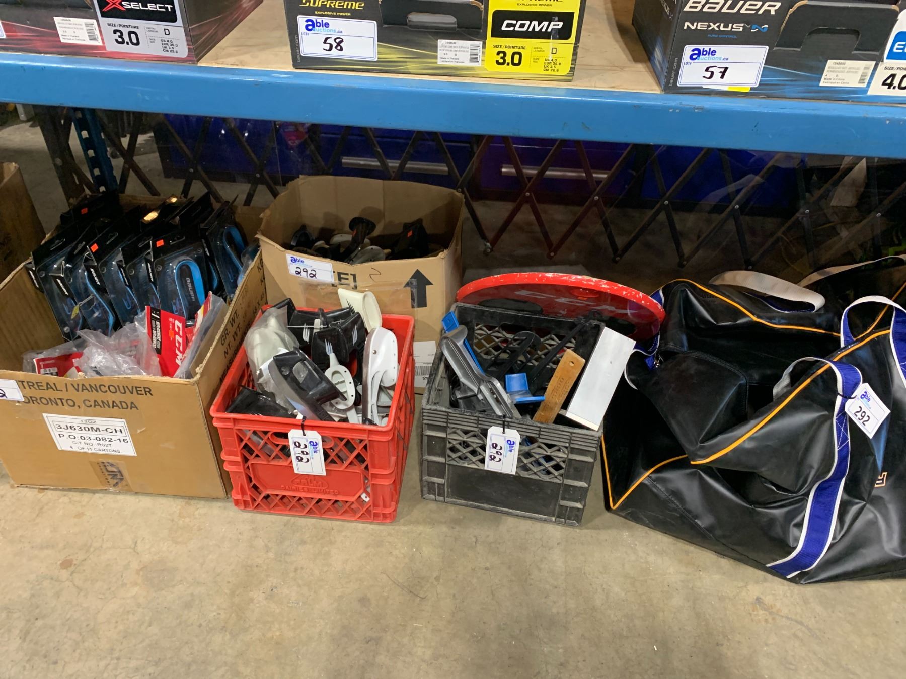 CCM FOOT MEASURING DEVICE/CRATE OF FOOT MEASURING DEVICES, LARGE EQUIPMENT BAG OF HOCKEY SOCKS, BOX OF BAUER SPEED PLATE HOCKEY INSOLES, BOX & CRATE OF BLADE HOLDERS WITH & WITHOUT BLADES