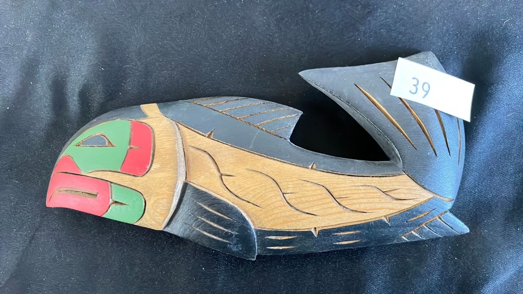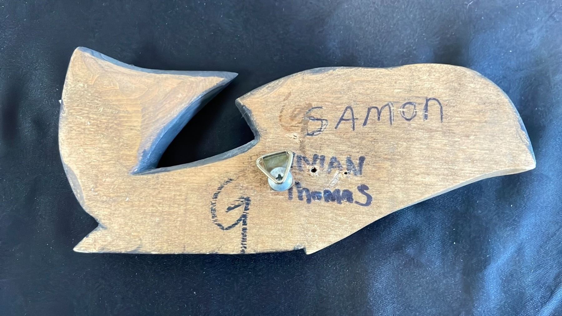 CEDAR SALMON CARVING BY VIVIAN THOMAS APPROX 7.5"L X 1"W X 3 3/4" H