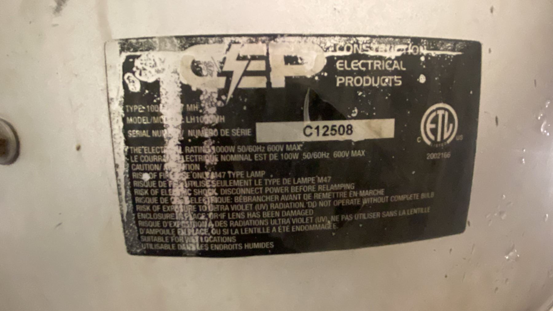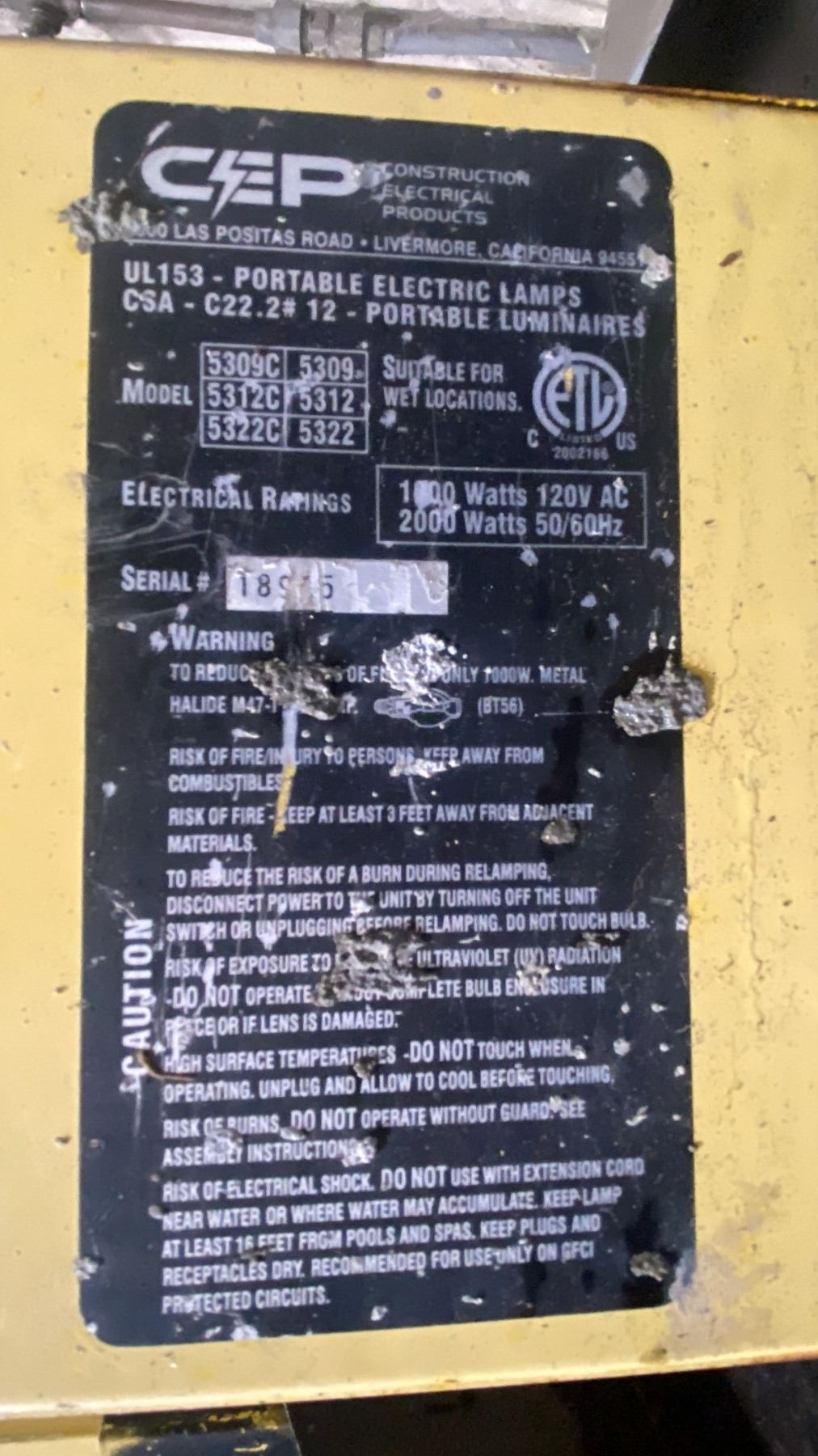 CEP LH1000MH YELLOW ELECTRIC INDUSTRIAL PORTABLE CONSTRUCTION SITE LIGHT