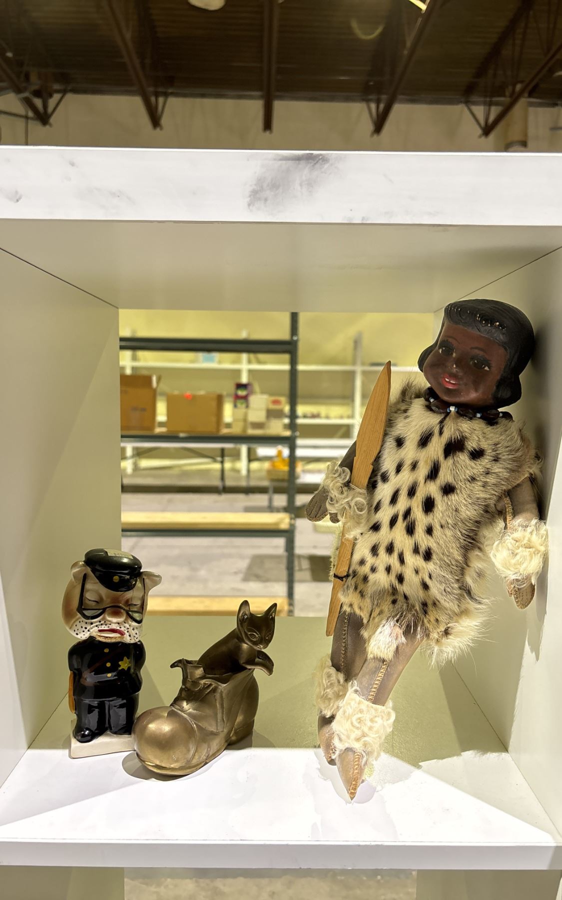 CERAMIC POLICE DOG BOBBLE HEAD, BRASS CAT IN A SHOE & REAL FUR FIRST NATIONS DOLL