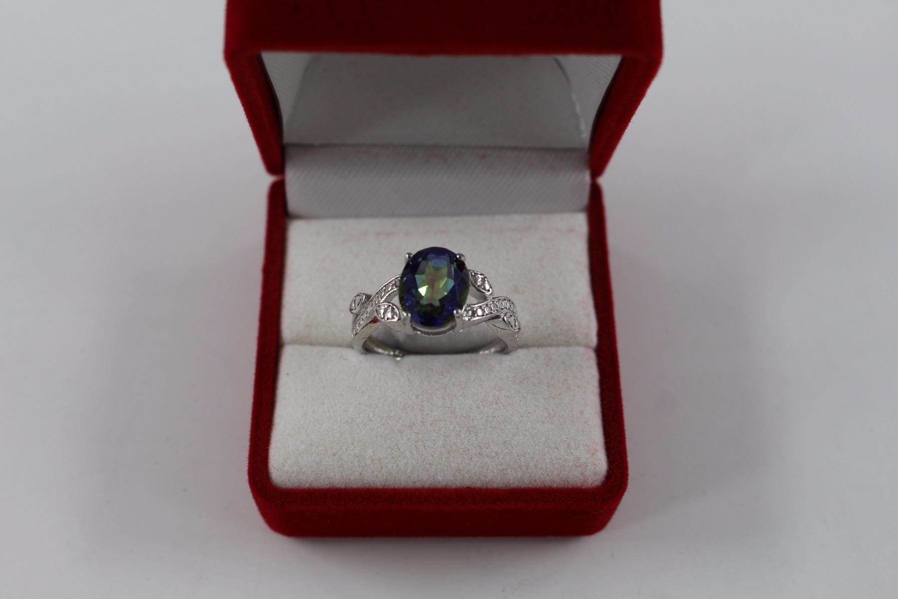 CERTIFIED MYSTIC TOPAZ & DIAMOND DINNER RING, 2.6CT OVAL CUT BLUE TOPAZ, 2 DIAMONDS, INCLUDES