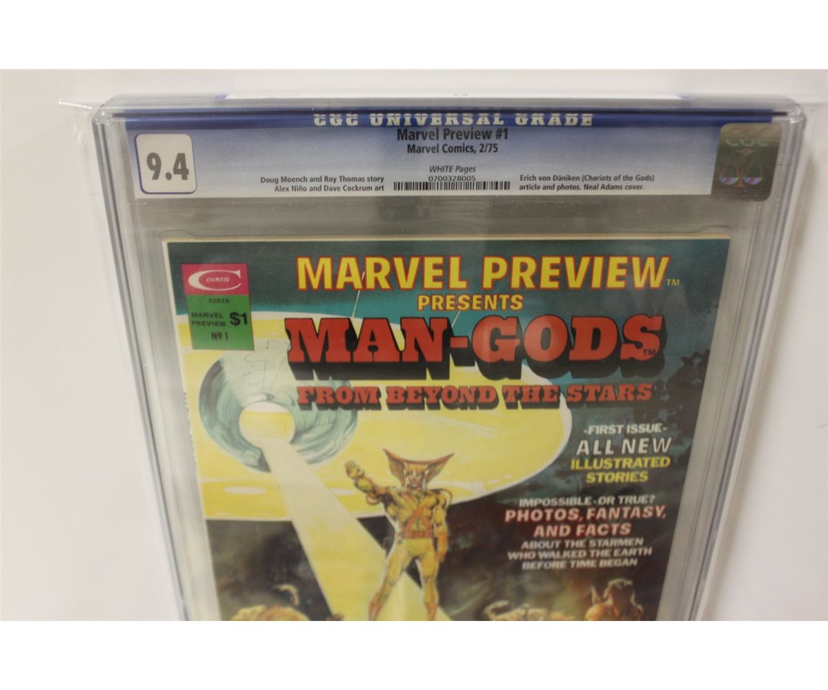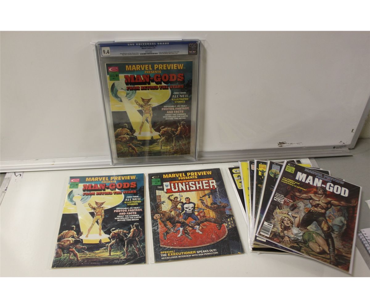 CGC MARVEL PREVIEW #1 & RUN.  11 ISSUES: #1, 2 (ORIGIN PUNISHER)9,11, 15, 16, 18-19, 24 X 2 COPIES.  INCLUDES #1 CGC 9.4 (NM) WHITE PAGES (2/75)