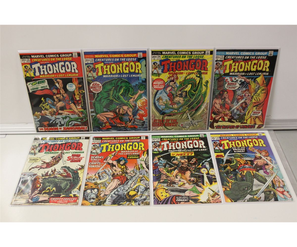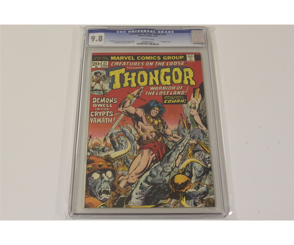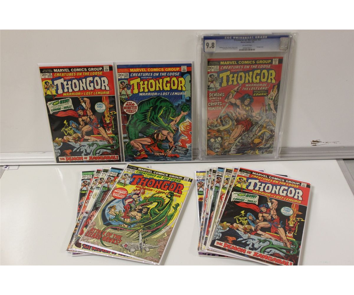 CGC THONGOR & TWO COMPLETE BRONZE SETS. THONGOR'S COMPLETE RUN IN CREATURES ON THE LOOSE #22 - 29 (1973-74) X 2 FULL SETS. ADDITIONALLY, #27 CGC 9.8 (NM/MINT) OFF-WHITE PAGES (1/74) *HIGHEST GRADED COPY ON THE PLANET* (CGC CASE HAS A PIECE MISSING TOP BACK RIGHT). 17 ISSUES TOTAL, MIXED GRADES, MANY HIGHER GRADE.