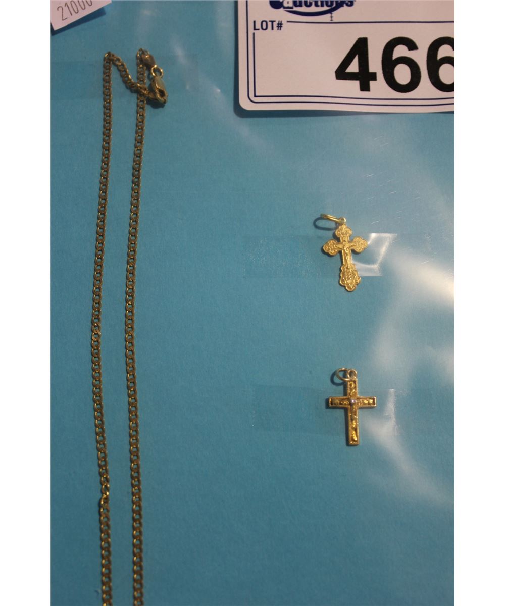 CHAIN AND 2 PENDANTS - ONE 14KT YELLOW CURBED LINK CHAIN REPLACEMENT VALUE $770, ONE 18KT YELLOW GOLD ITALIAN MADE CROSS PENDANT REPLACEMENT VALUE $200 AND ONE 10KT YELLOW GOLD & 22KT GOLD PLACER GOLD DIAMOND SET CROSS PENDANT REPLACEMENT VALUE $325.