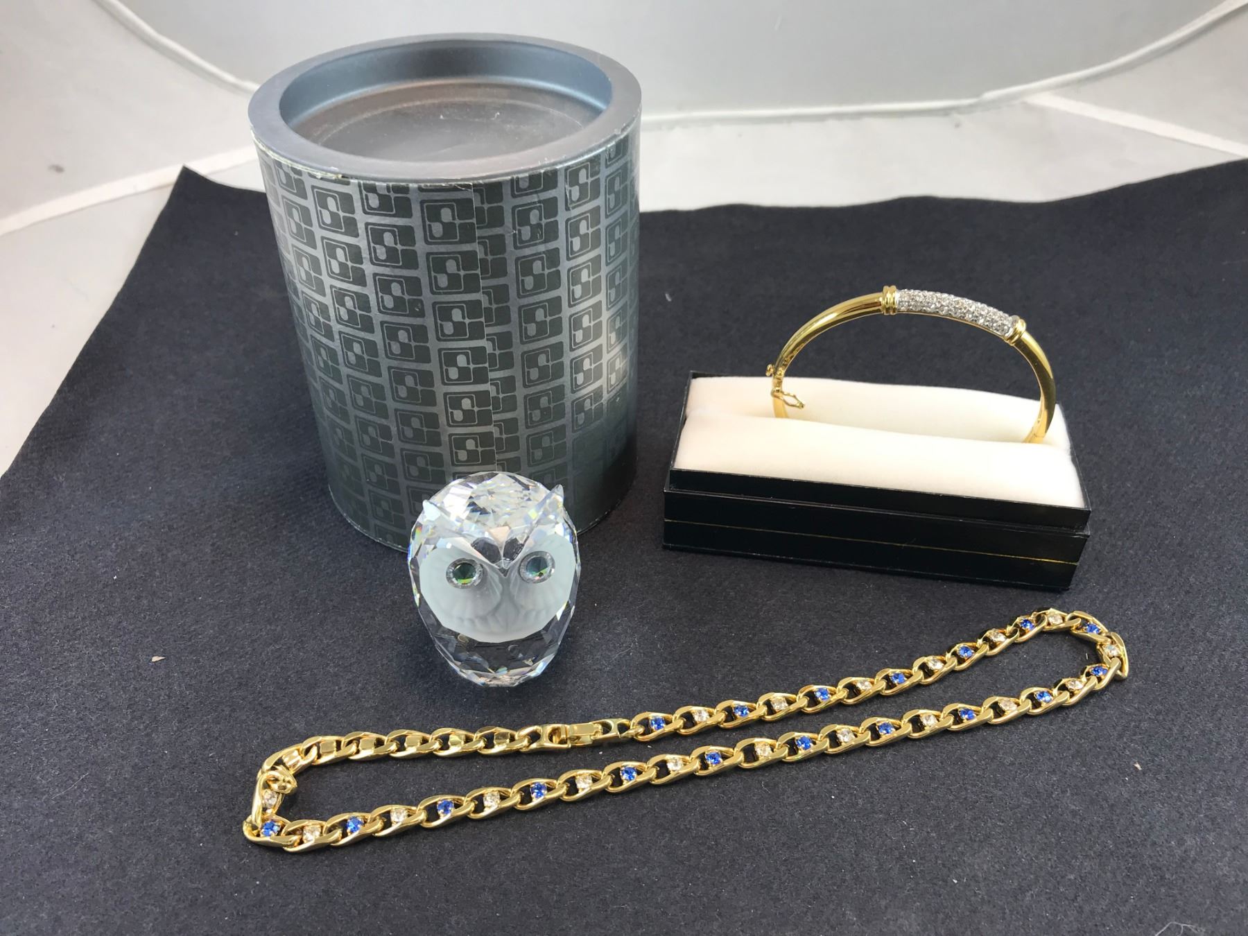 CHAIN NECKLACE WITH WHITE & BLUE GEMS, HANDMADE FIFTH AVENUE BRACELET & SWAROVSKI CRYSTAL OWL
