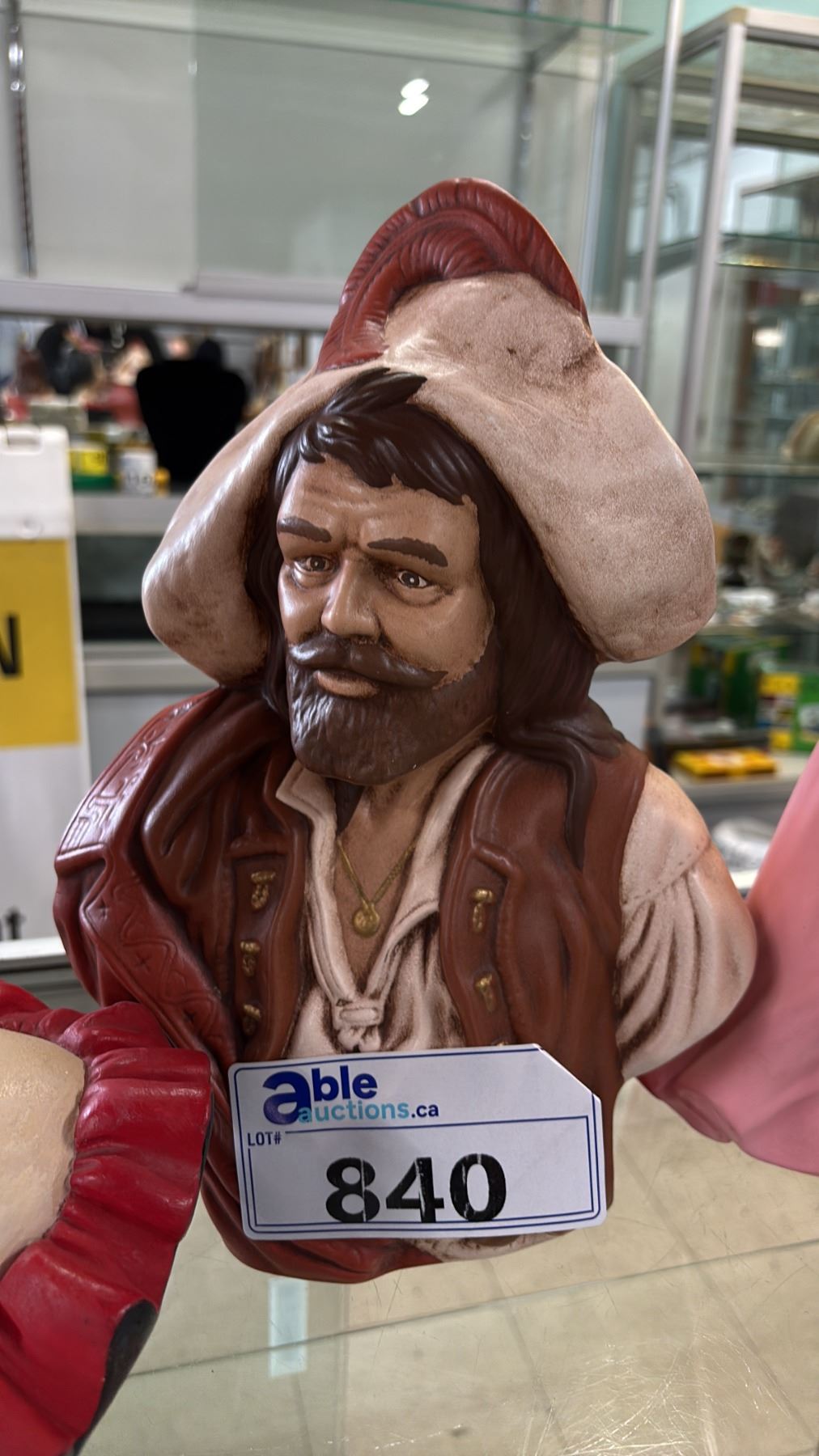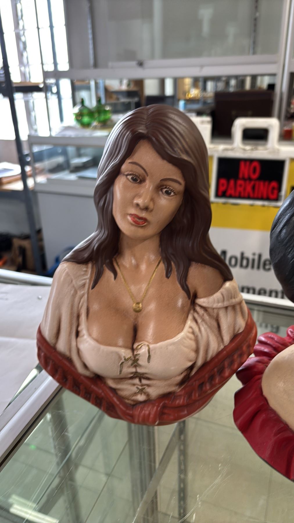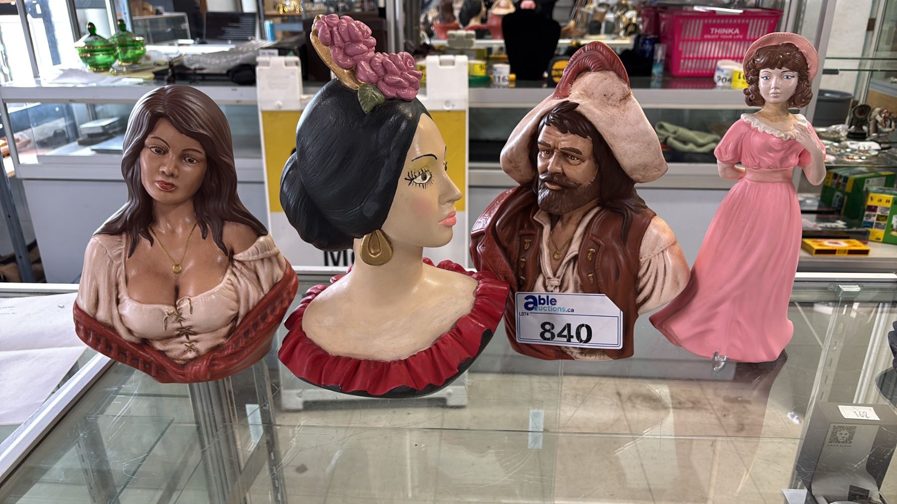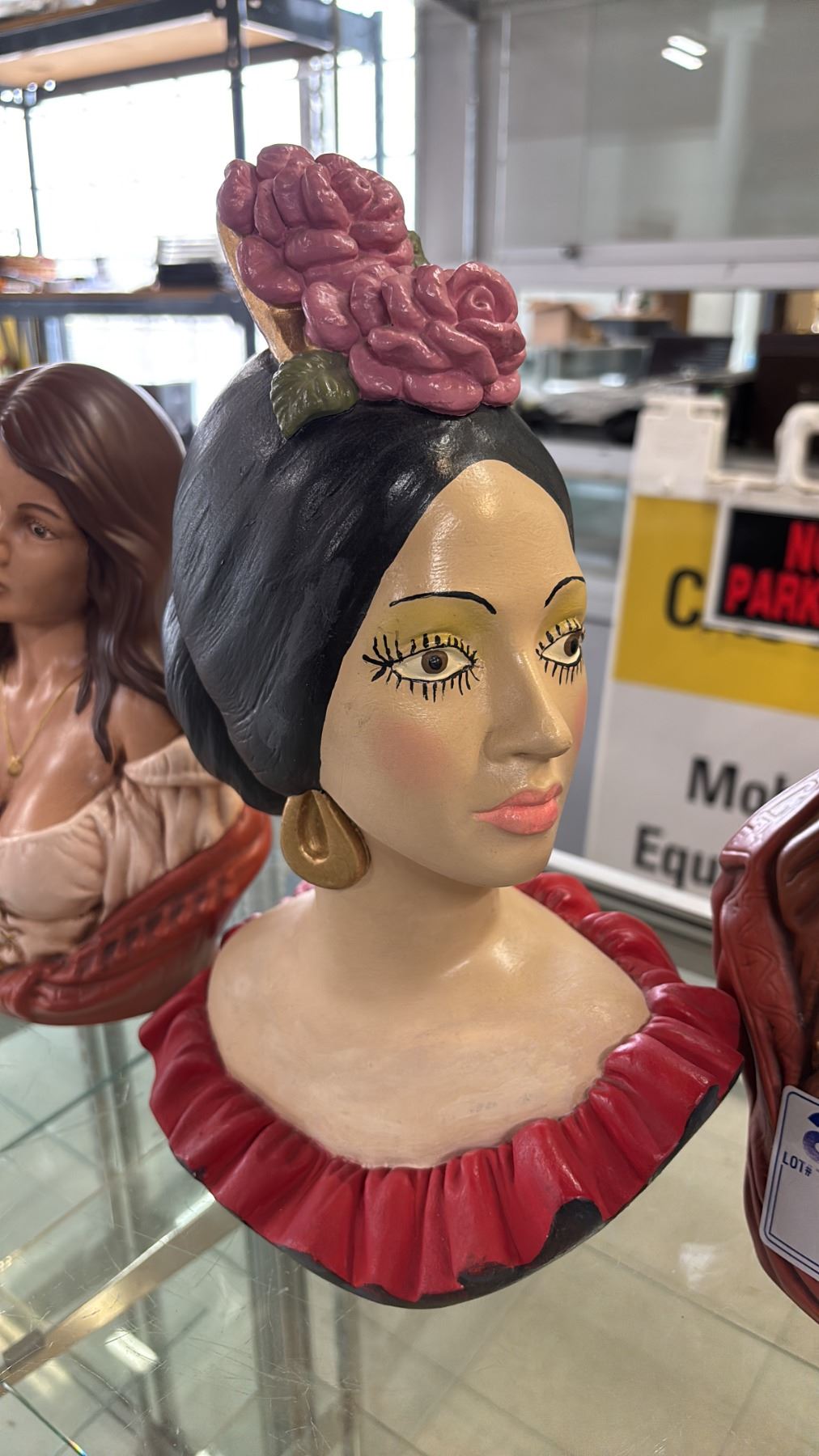 CHALKWARE SPANISH LADY BUST, HOLLAND MOLD CERAMIC BUCANEER & GYPSY BUSTS & PAINTED CERAMIC FIGURE