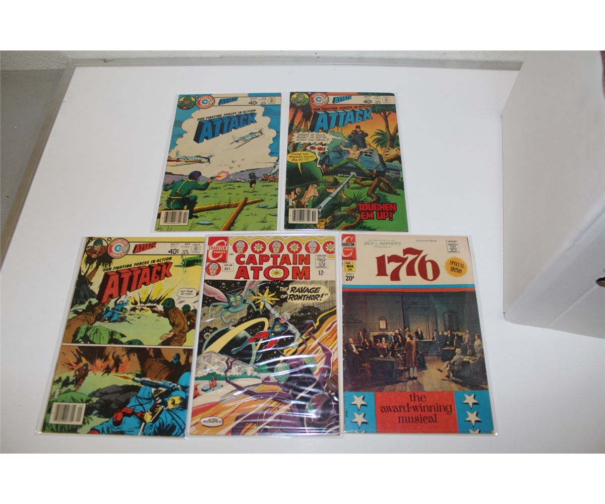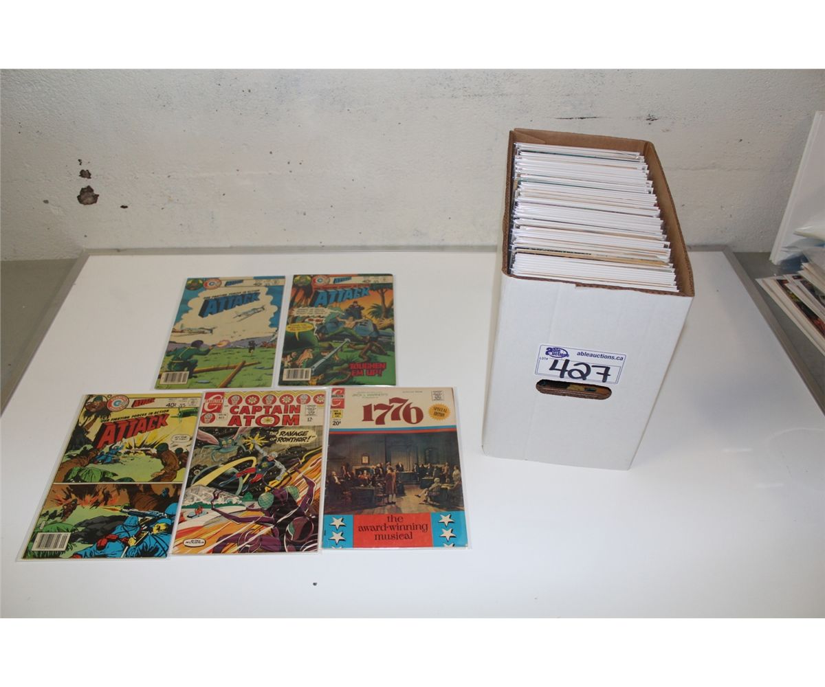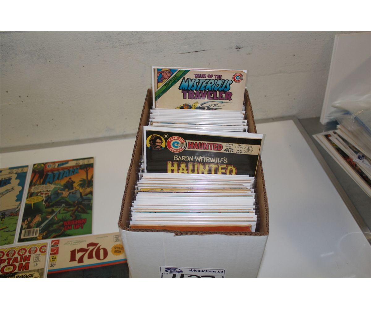 CHARLTON PUBLISHING BRONZE AGE SHORT BOX OF MIXED GENRES & TITLES. INCLUDES HORROR, WAR, ETC. MIXED GRADES.
