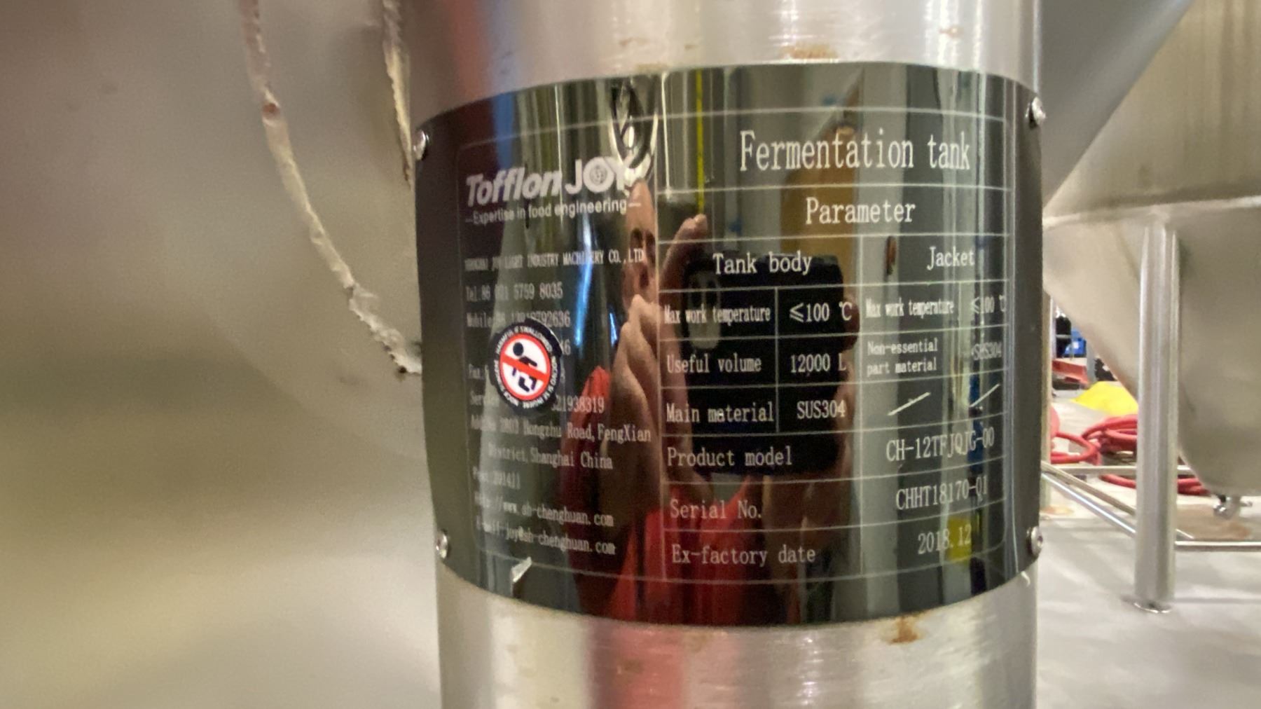 CHENGUAN INDUSTRY 12,000-LITER STAINLESS STEEL FERMENTATION TANK UNDER TOFFLON JOY MODEL CH-12TFJQJG-00, APPROX 18'H X 8'D FEET *BUYER WILL REQUIRE ANY TOOLS/EQUIPMENT AND HELP NECESSARY FOR REMOVAL* *REQUIRES HIAB/CRANE FOR REMOVAL*