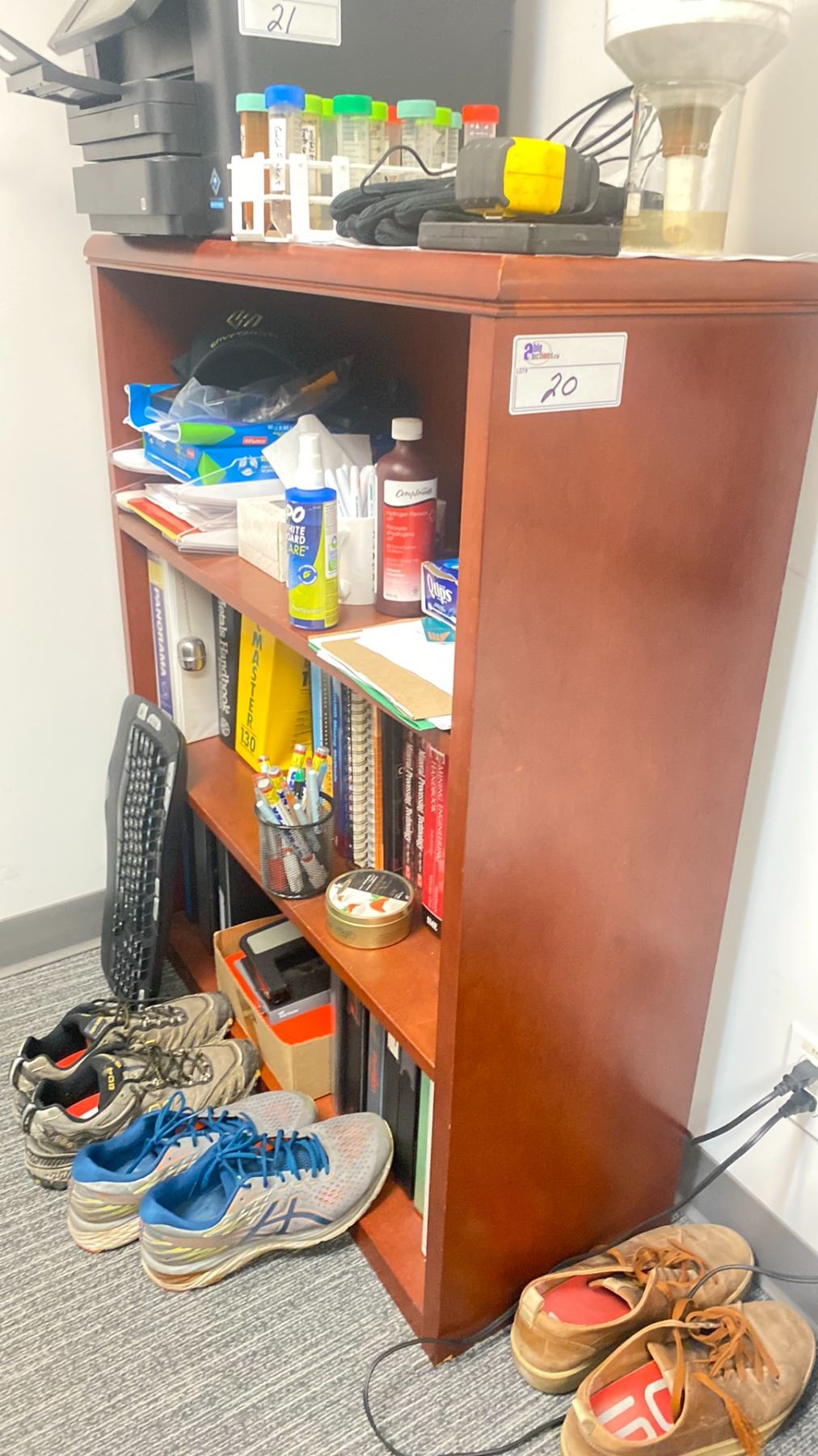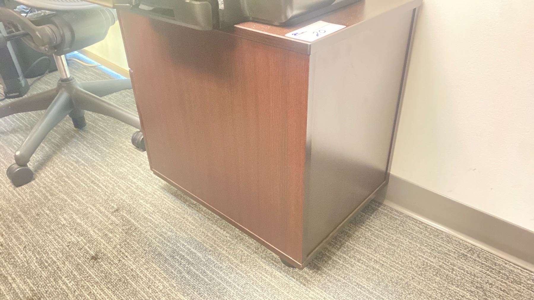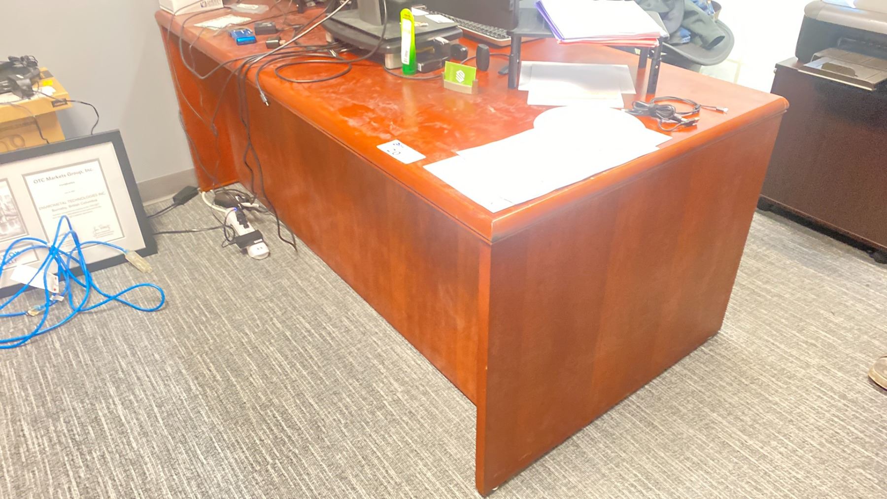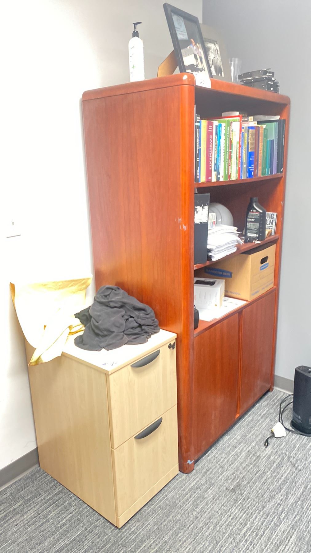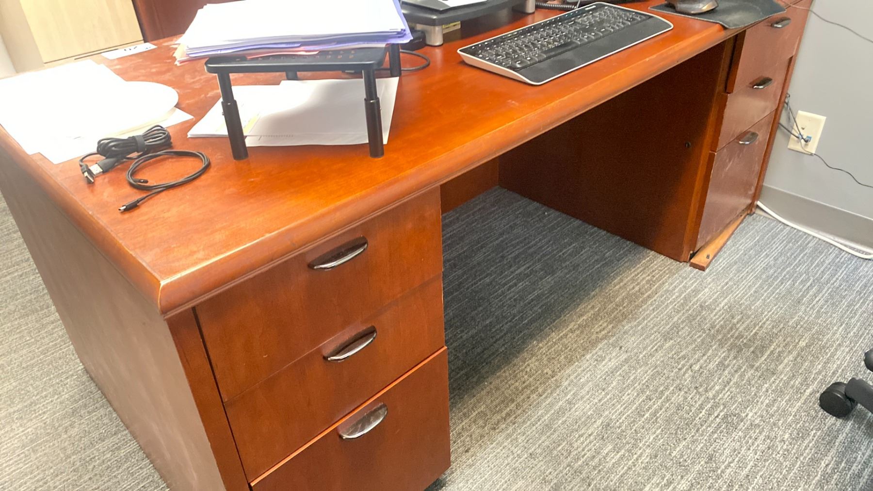 CHERRY COLORED 70"W X 36"D X 29"H 6 DRAWER OFFICE DESK WITH KEYBOARD TRAY, CHERRY COLORED 3 TIER 37"W X 24"D X 70"H CABINET, CHERRY COLORED 3 3 TIER 35"W X 14"D X 43"H BOOKSHELF, DARK WOODEN 2 DRAWER LOCKING PEDESTAL, LIGHT WOODEN 2 DRAWER PEDESTAL & A 72"W WHITE BOARD *CONTENTS NOT INCLUDED*