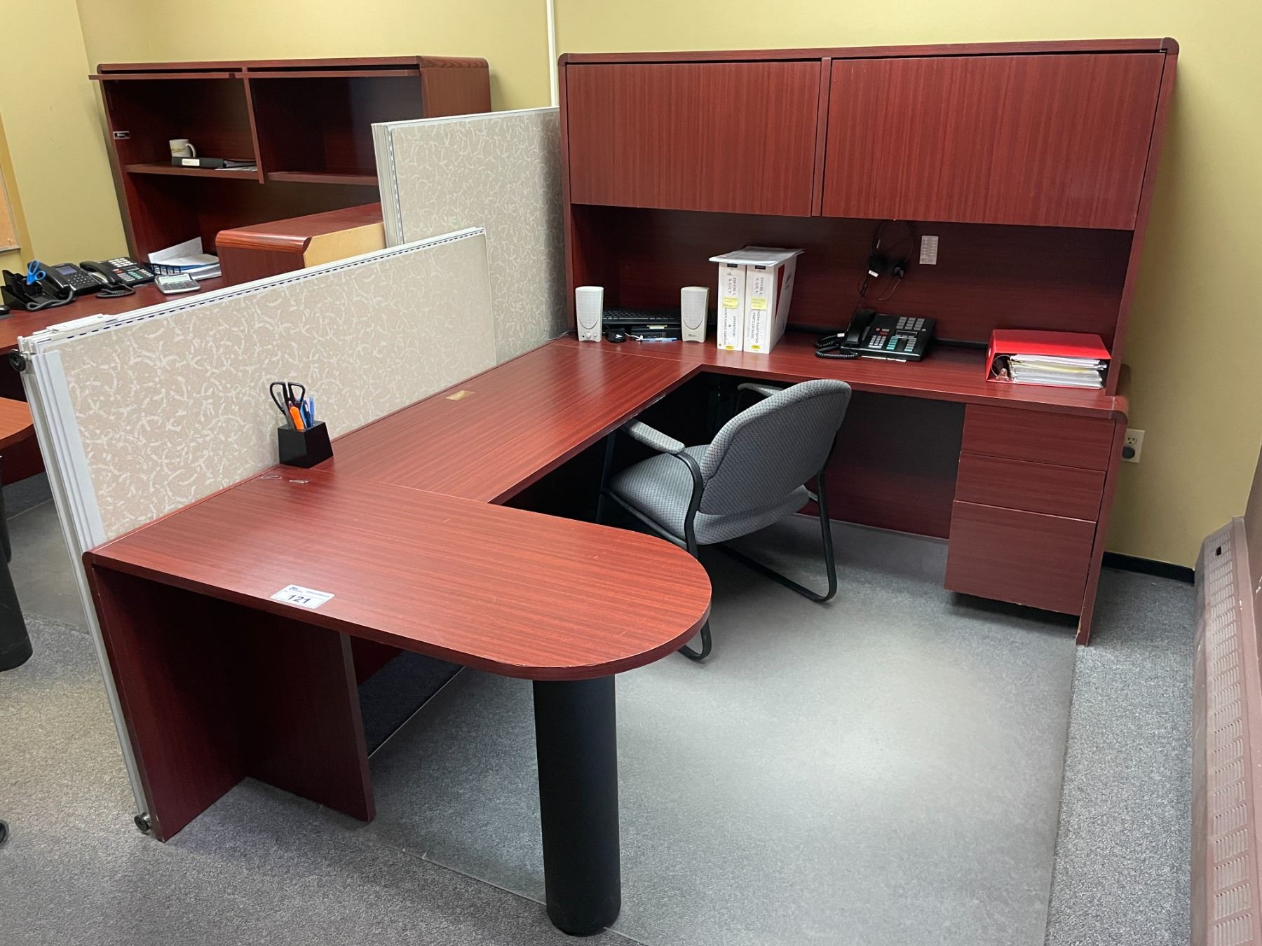CHERRY COLOURED U-SHAPED SINGLE PEDESTAL DESK WITH HUTCH AND 2 - 6' BOOKCASES