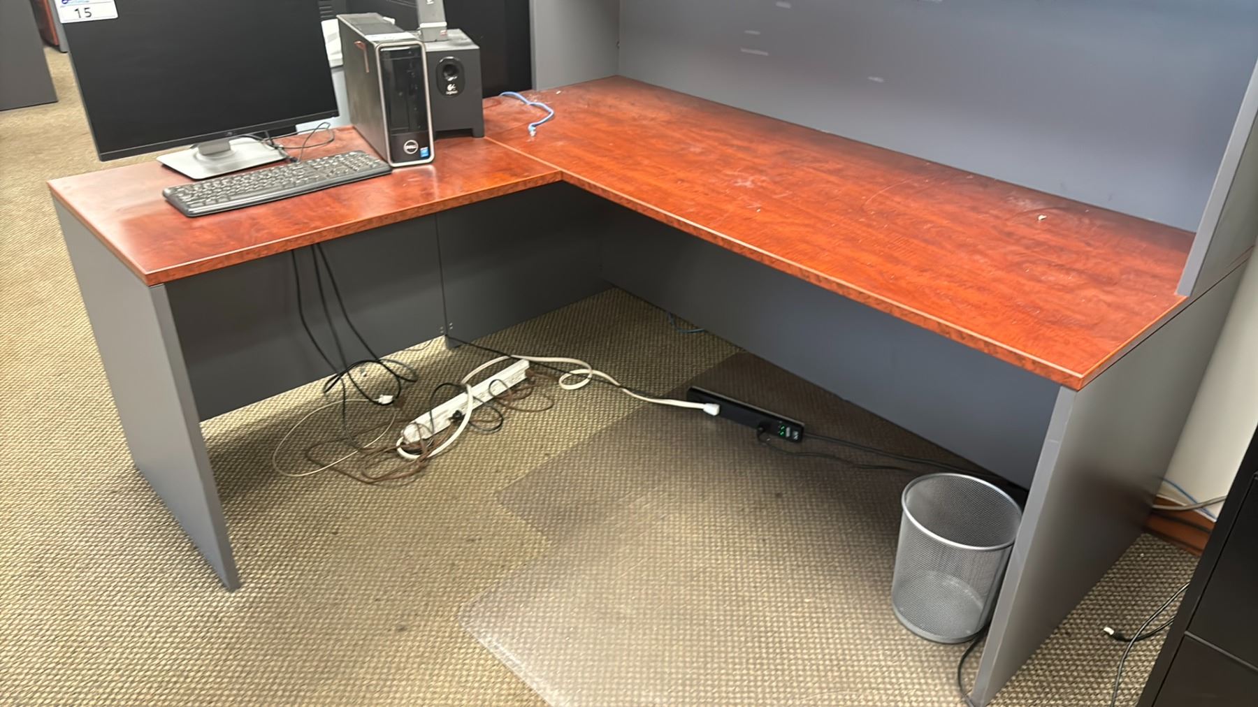 CHERRY L-SHAPED DESK WITH HUTCH AND MESH BACK CHAIR