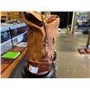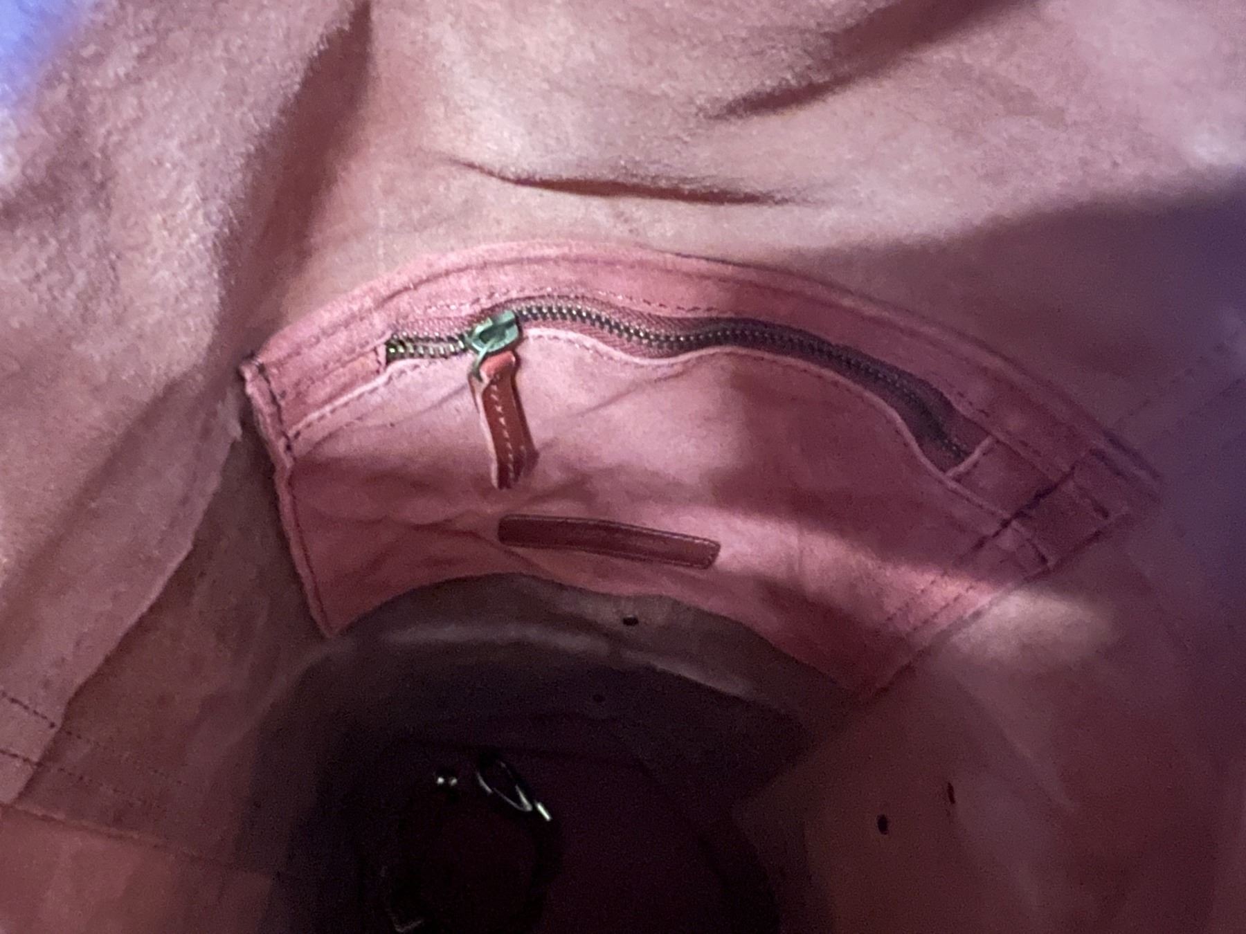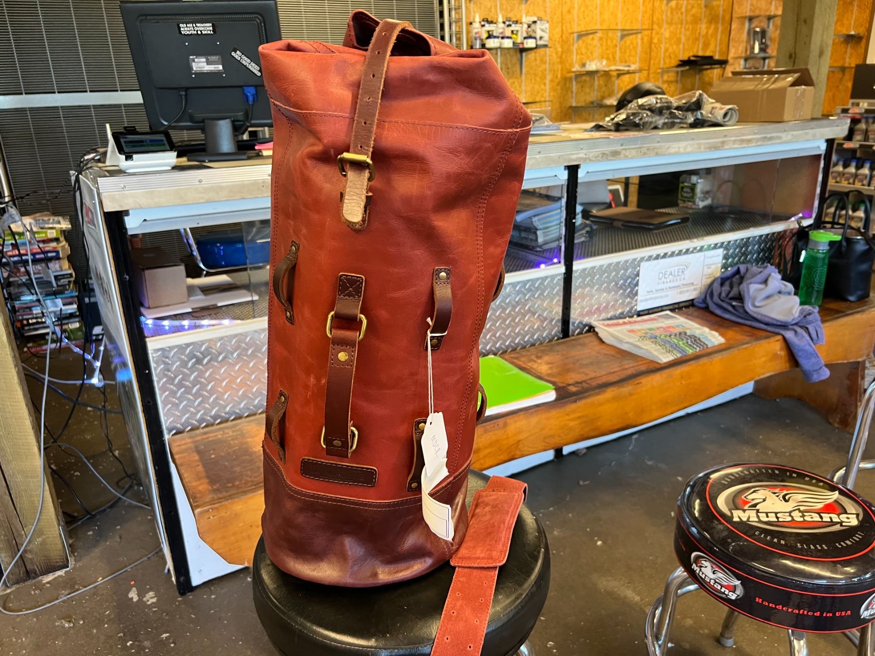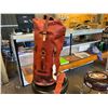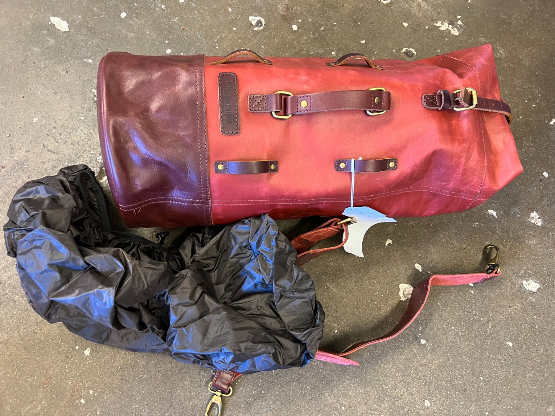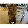 CHERRY LEATHER DUFFLE BAG 22"H X 9.5"W - INSIDE ZIP COMPARTMENT, SHOULDER STRAP & RAIN COVER