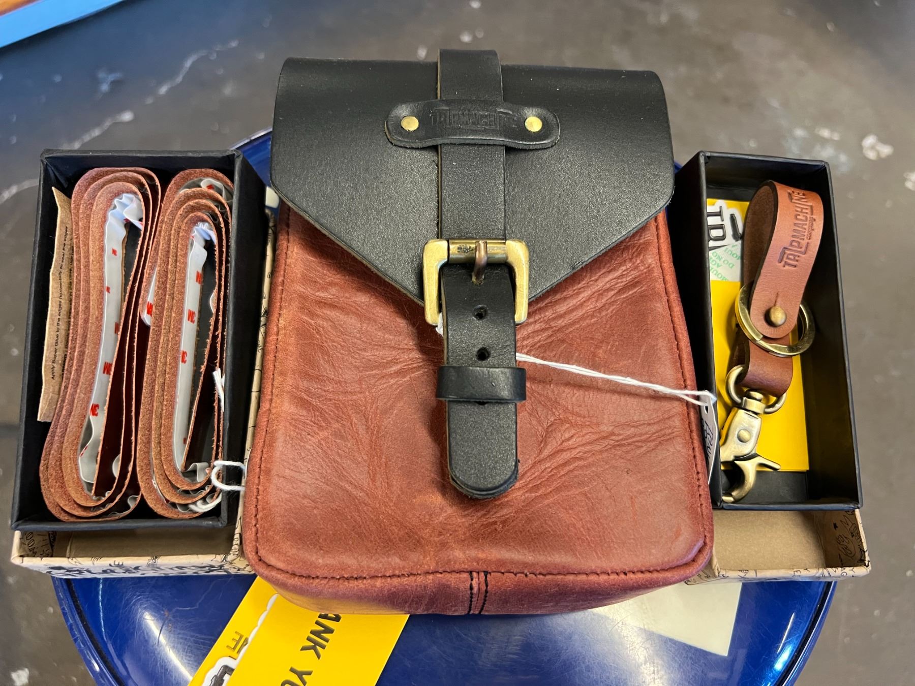 CHERRY LEATHER TANK POUCH 8"H C 2"W X 6"L, CHERRY LEATHER KEY FOB & CHERRY LEATHER GRIP WRAPS