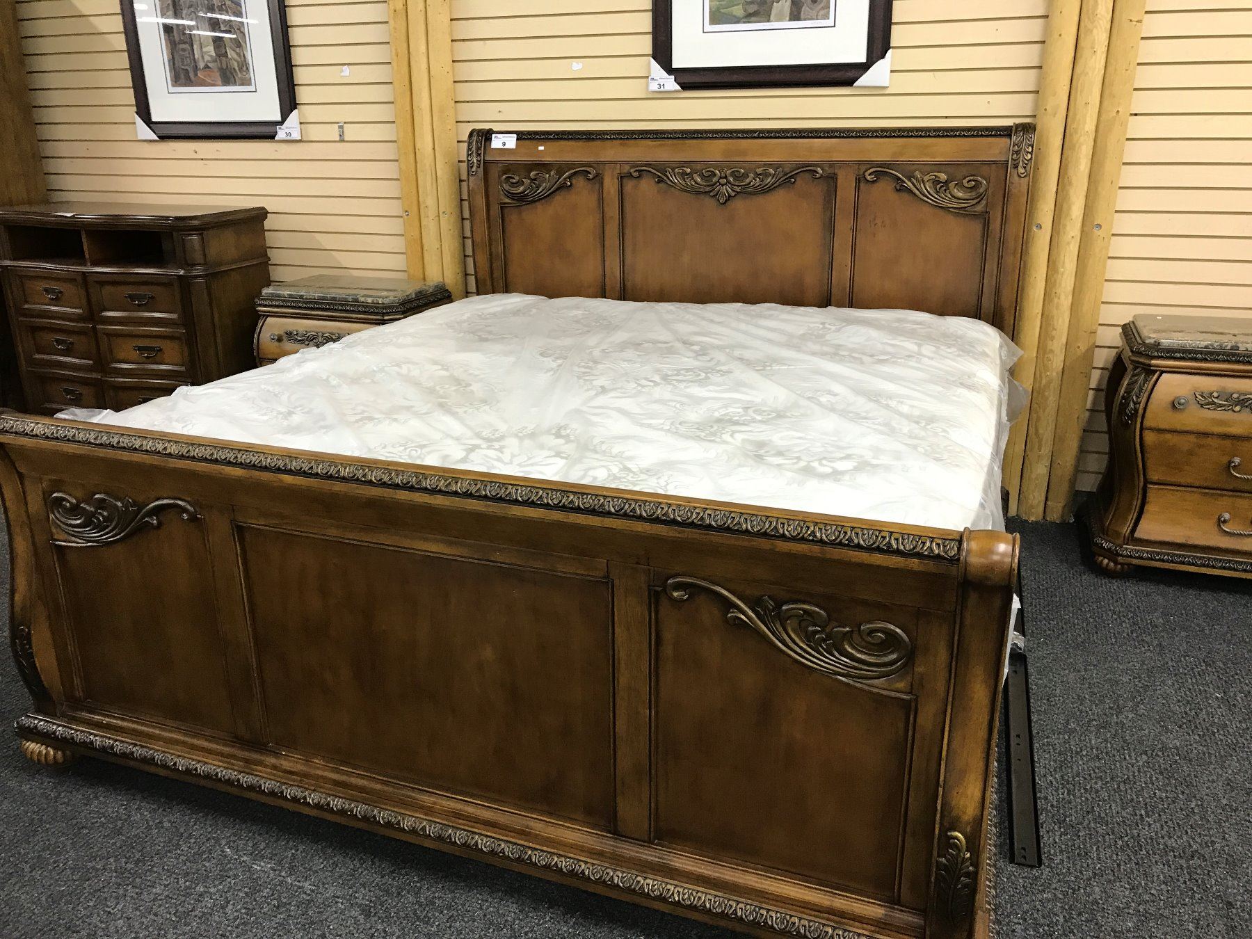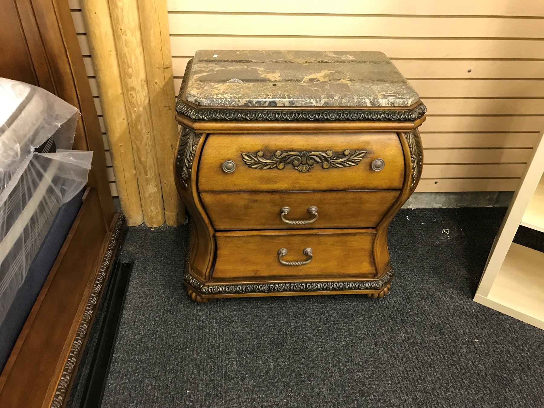 CHERRY TRADITIONAL STYLE KING SIZE BED WITH MATCHING MARBLE TOP NIGHT STANDS, MATTRESS NOT INCLUDED