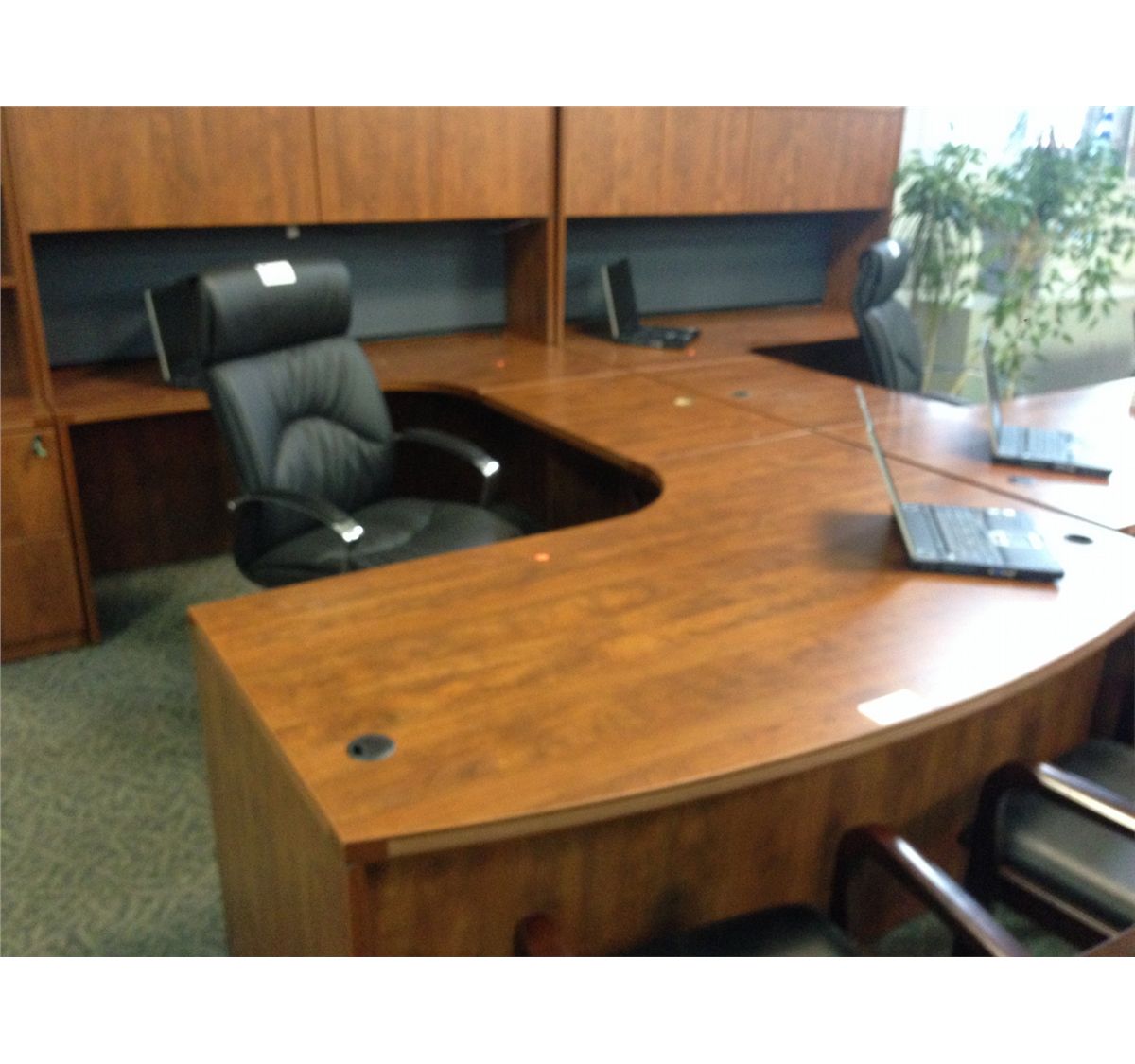 CHERRY U-SHAPED BOW FRONT EXEUCUTIVE OFFICE SUITE WITH HUTCH