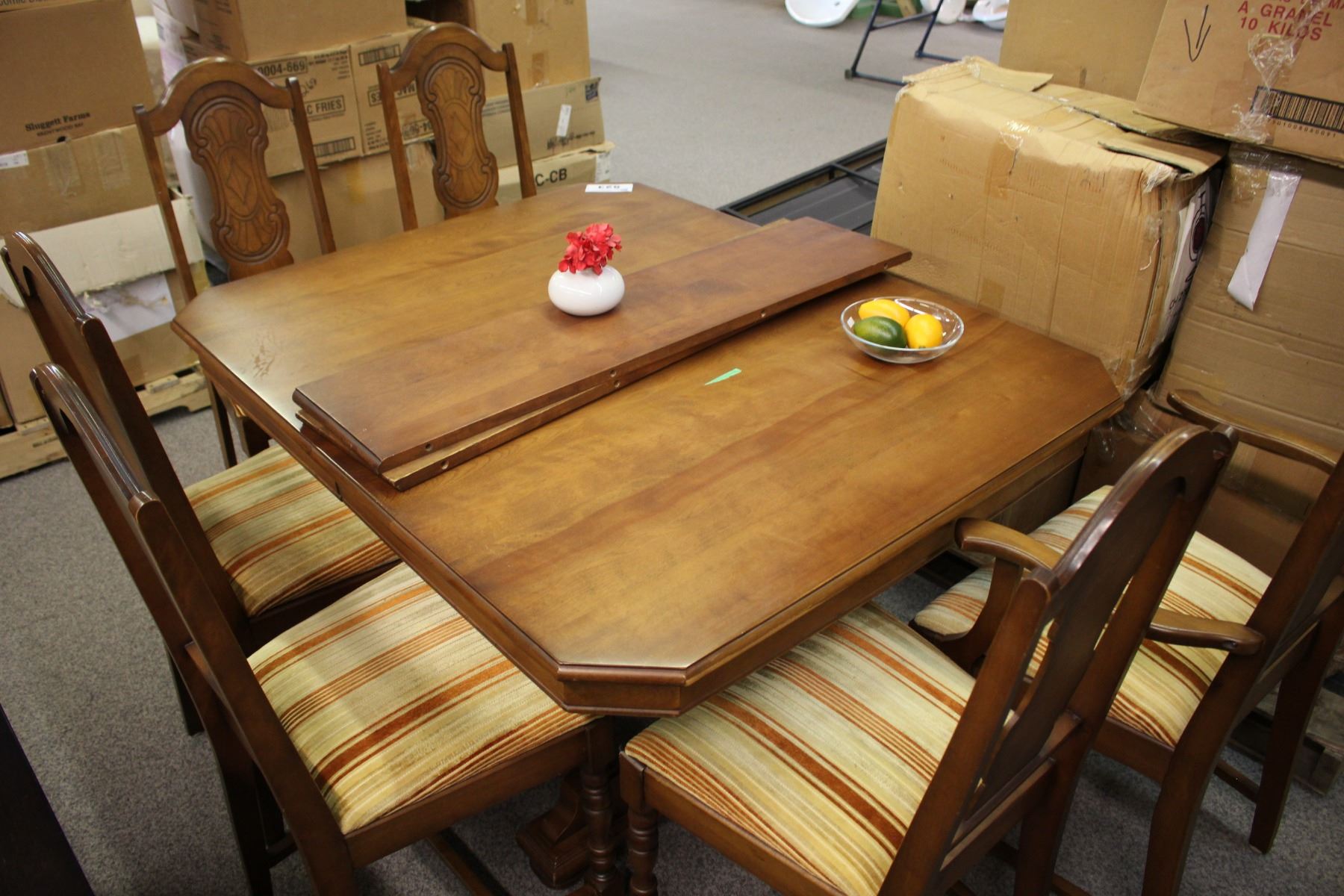 CHERRY WOOD DINING TABLE WITH 6 WOOD FRAME DINING CHAIRS, 2 LEAVES, AND HUTCH