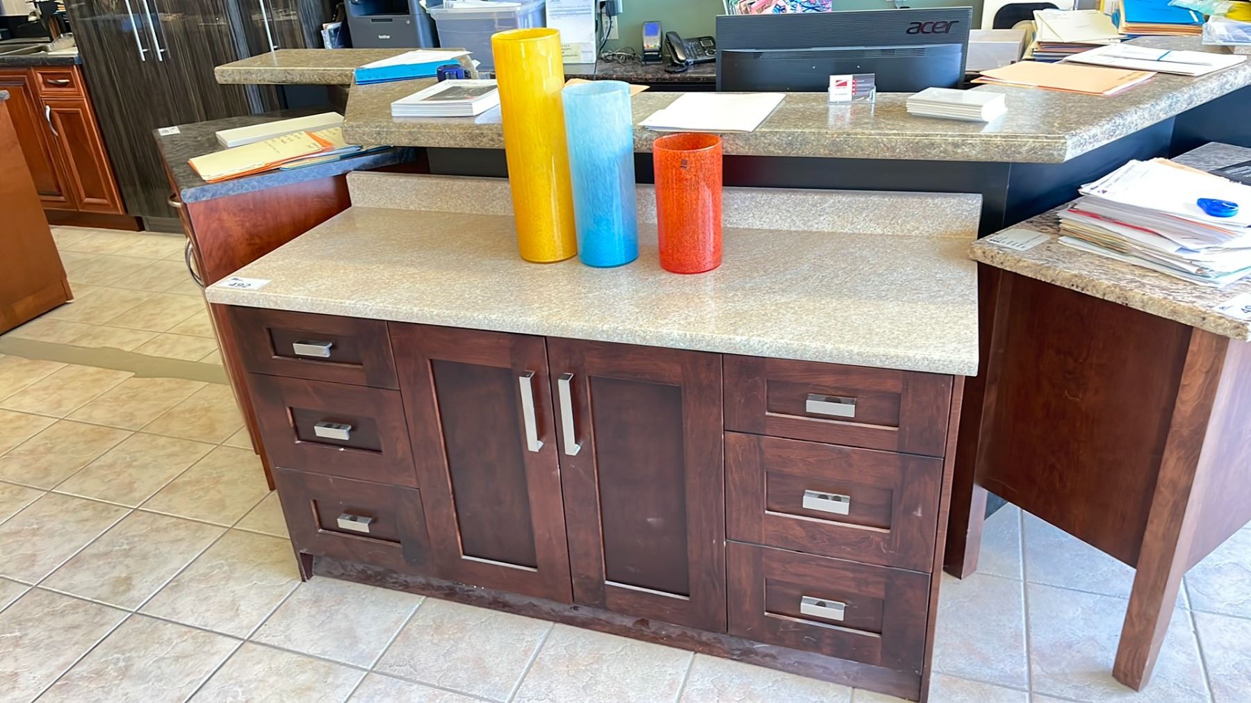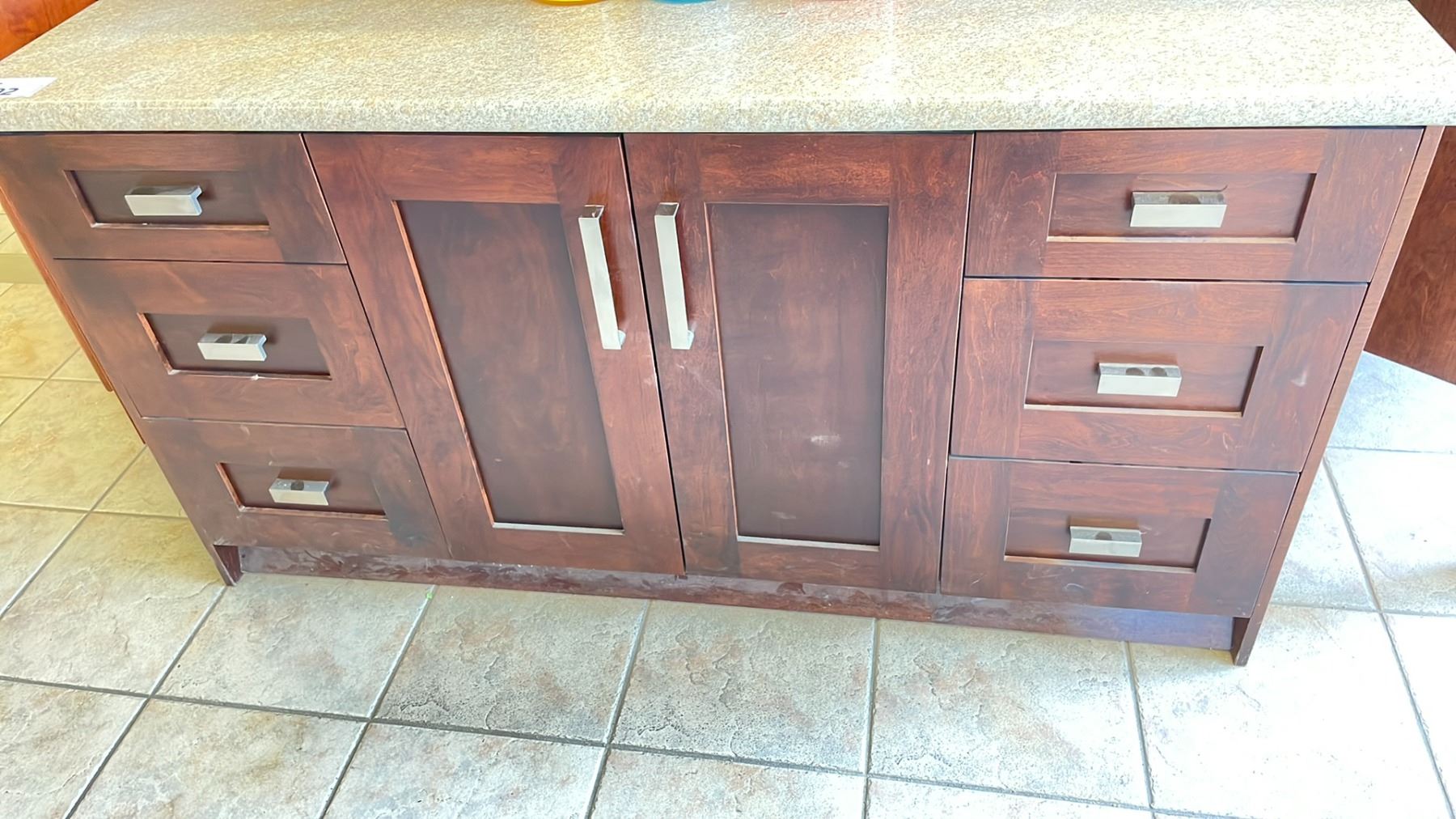 CHERRY WOOD FINISH 6 DRAWER 2 DOOR 60"W X 23"D X 32'H ARBORITE TOP VANITY
