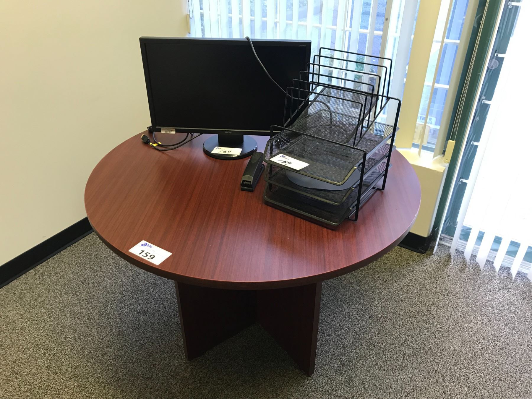 CHERRYWOOD FINISH 42" DIAMETER ROUND OFFICE TABLE W/MONITOR, STAPLER AND PAPER HOLDERS