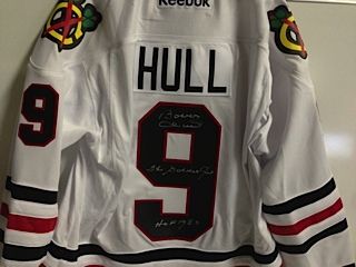 CHICAGO BLACKHAWKS #9 BOBBY HULL JERSEY SIGNED BY BOBBY HULL 'THE GOLDEN JET, H.O.F. 1983'