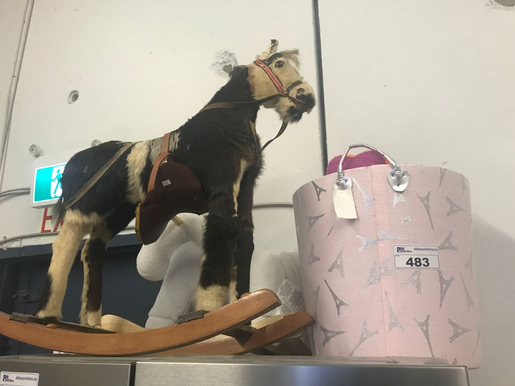 CHILDS ROCKING HORSES & BASKET OF ASSORTED DOLLS/TOYS