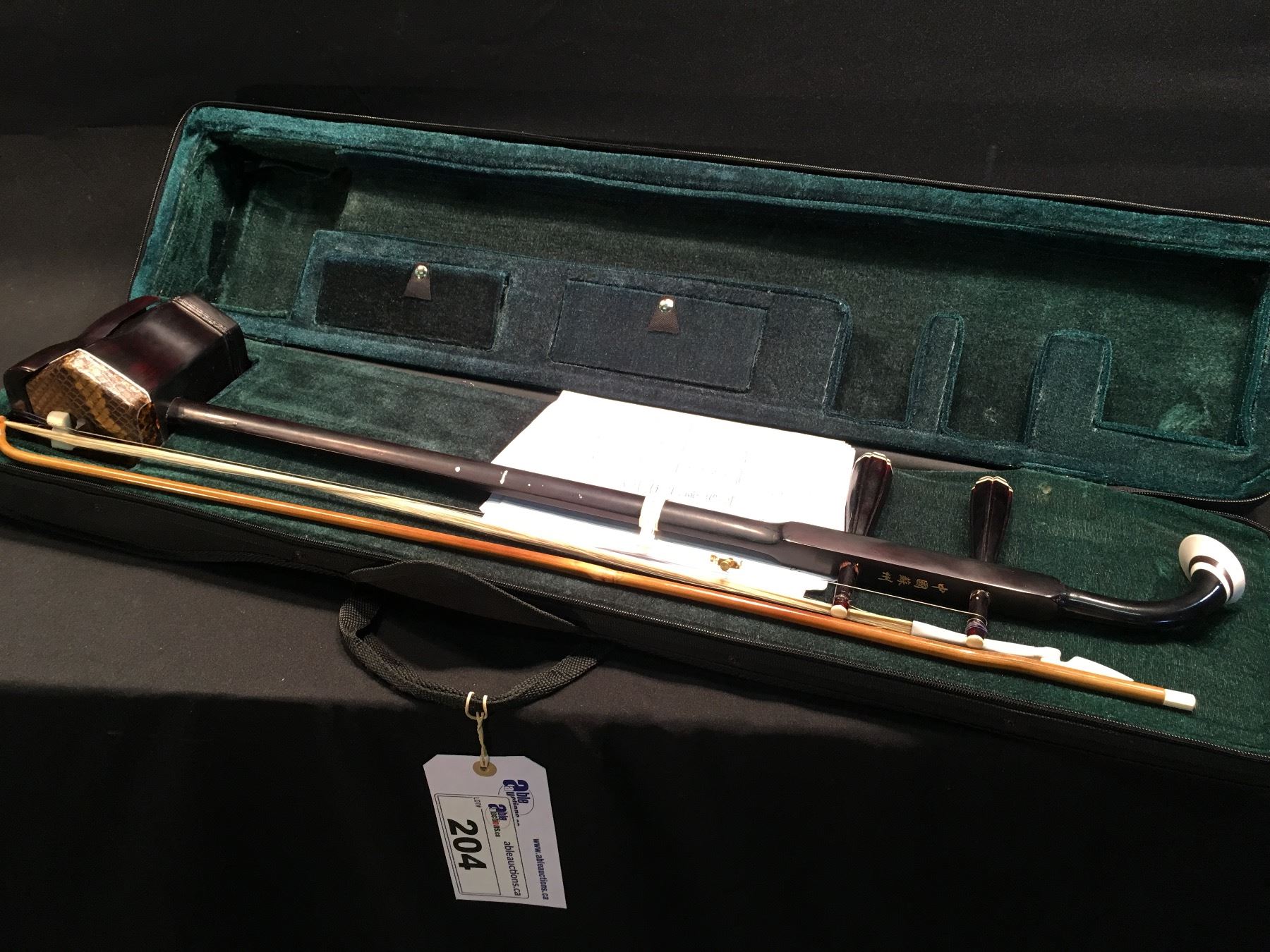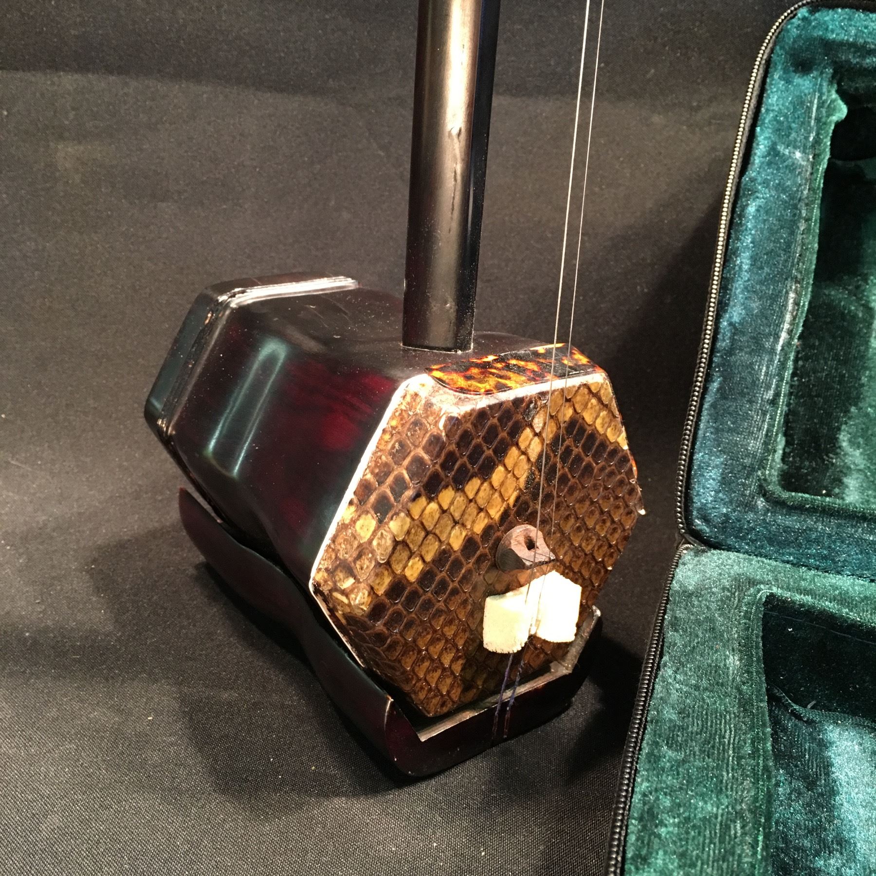 CHINESE ERHU, TRADITIONAL 2 STRING BOWED INSTRUMENT, WITH PYTHON SKIN RESONATOR, COMES WITH PIEZO PICKUP, AND HARD SHELL ZIPPER CASE