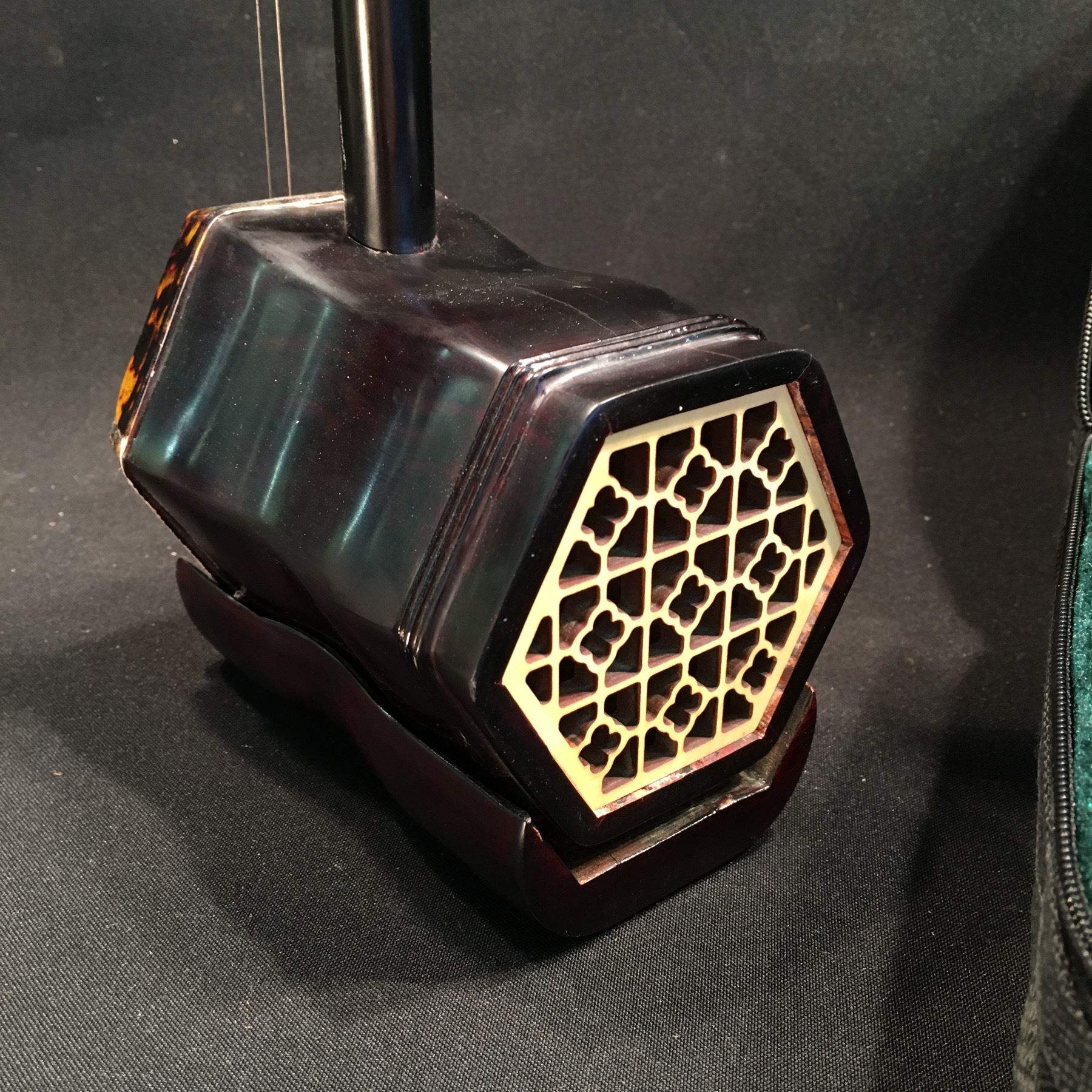 CHINESE ERHU, TRADITIONAL 2 STRING BOWED INSTRUMENT, WITH PYTHON SKIN RESONATOR, COMES WITH PIEZO